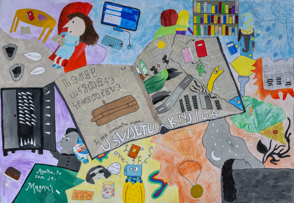 U kategoriji Kreativni uradak, na temu U svijetu knjige naša učenica Ema Domišljanović izradila je plakat na kojem je predstavila pročitane knjige uz poruku i pozivanje svih dobnih skupina na zajedničko druženje uz knjige, prijateljstvo, pomaganje i otkrivanje i istraživanje svoje okoline, međuljudskih odnosa, povijesne i kulturne baštine, otkrivanje novih legendi, razvijanje mašte i novih igara. Ona svima poručuje da ne treba odustajati u svojim namjerama. Budite uporni u radu, puni samopouzdanja, želje za promjenama, uspjehom i druženjem. Video pozivom u Teams aplikaciji, Ema je usmenim izlaganjem predstavila Povjerenstvu svoj rad. Osim vrednovanja likovnog rada u usmenom predstavljanju kreativnog uratka Povjerenstvo je vrednovalo sadržaj, strukturu i vještinu izlaganja te odgovaranje na pitanja o izboru motiva, likovnih tehnika, namjene plakata.