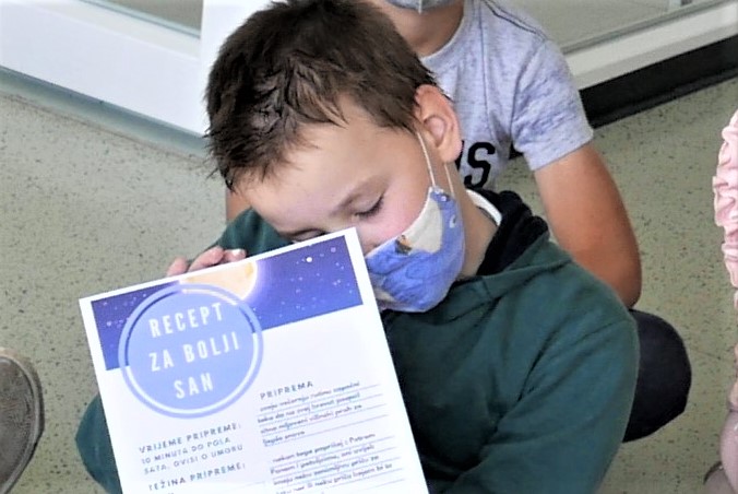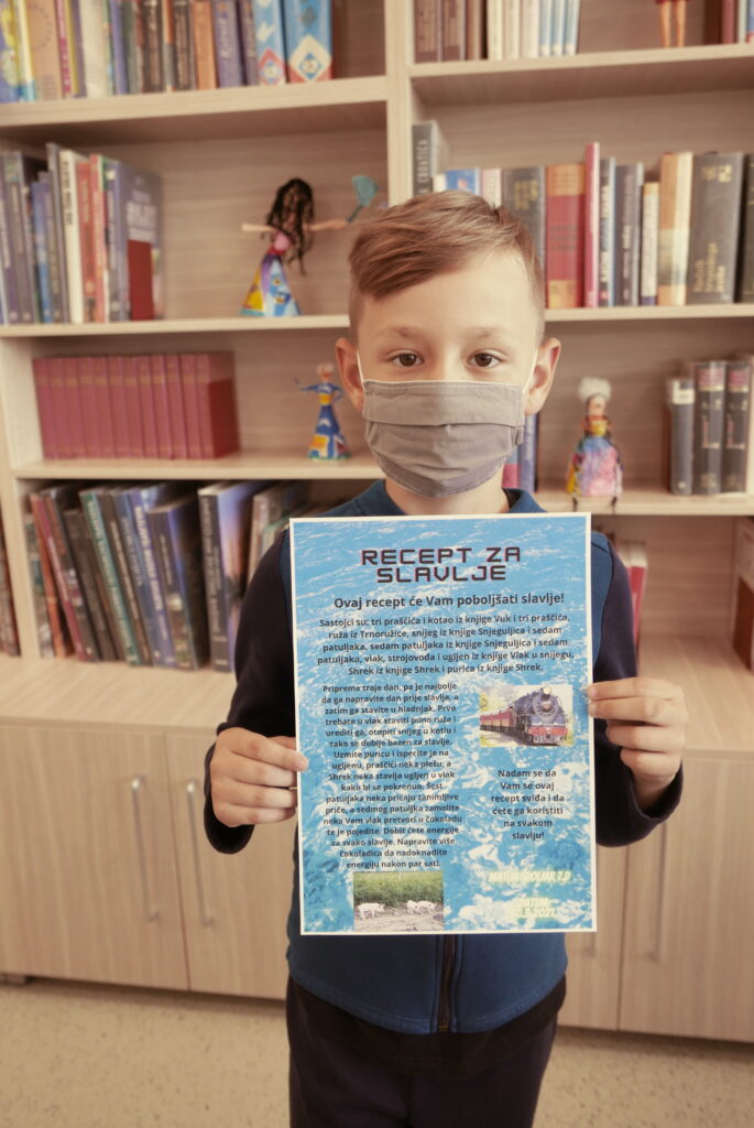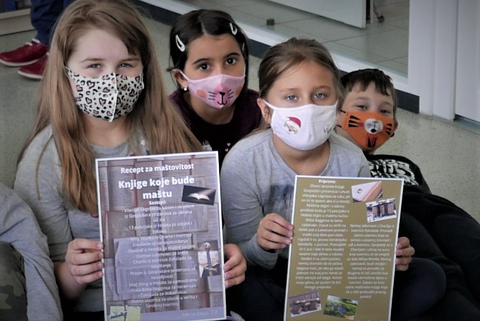 Učenicima 1. i 2. razreda pročitala je najljepši recept za prehraniti dušu knjigama, a koji su izabrali. Tada su maštali stvarajući novu priču sa svojim stvarnim i nestvarnim prijateljima. U 3. i 4. razredima učenici su sami birali i čitali naglas najzanimljivije recepte ostalim učenicima u grupi. Objašnjavali su zašto im se vizualno svidio plakat, kao i tema, sadržaj, motiv, likovi i predmeti recepta. U nekim razredima učenici su maštali zatvorenih očiju slušajući o nekom putovanju iz priče, a nakon toga su opušteno razgovarali s knjižničarkom o zamišljenim putovanjima s knjigom u ruci.