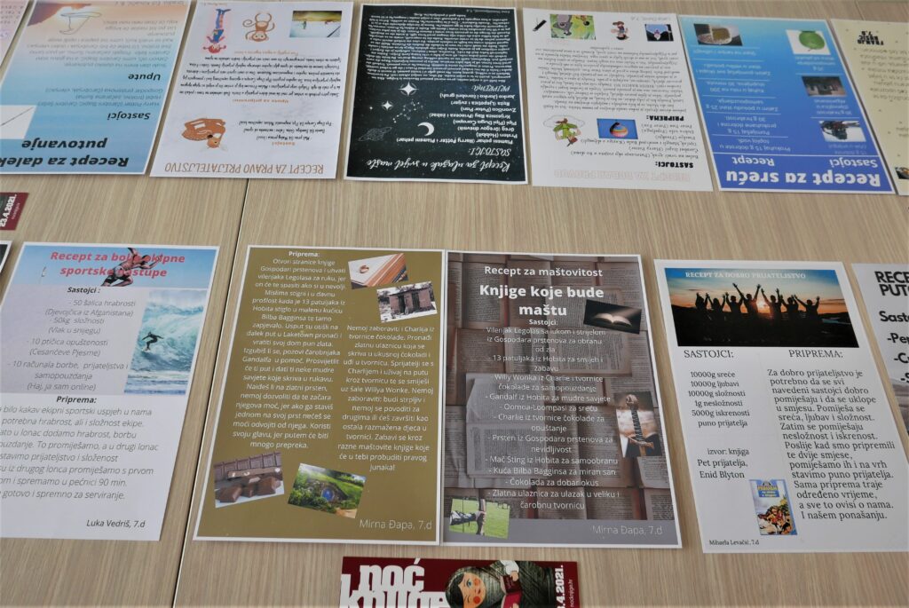 Nedavna aktivnost u knjižnici je postavljena izložba radova učenika viših razreda na temu Ljekoviti recepti za prehraniti dušu, a povodom obilježavanja Noći knjige 23.4.2021. Izložbu su od 23. 4. 2021. razgledavali učenici od 1. – 4. razreda.