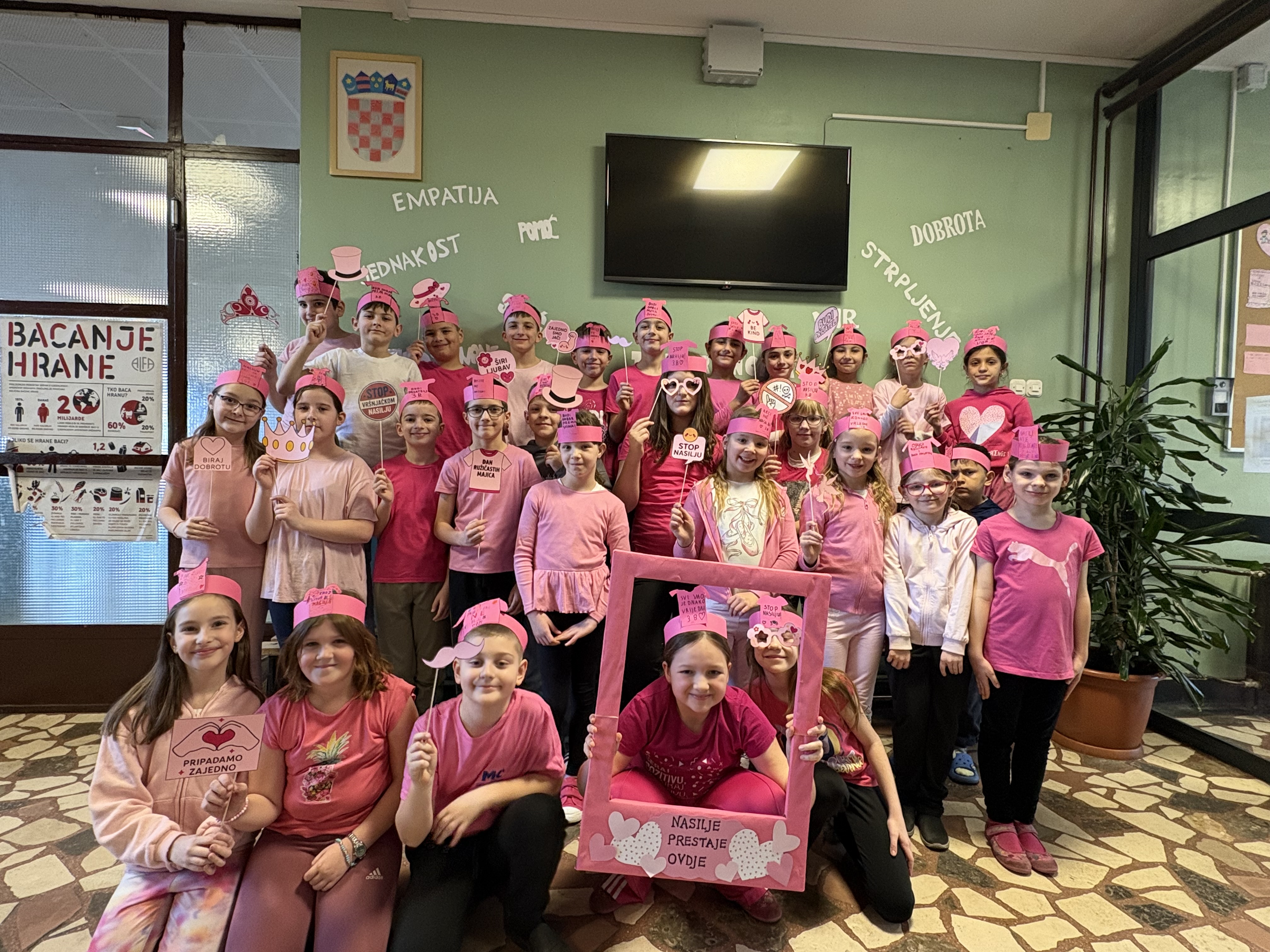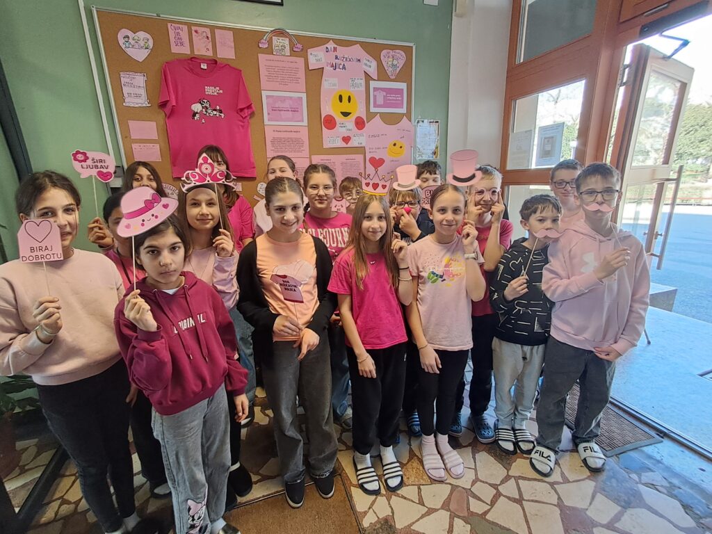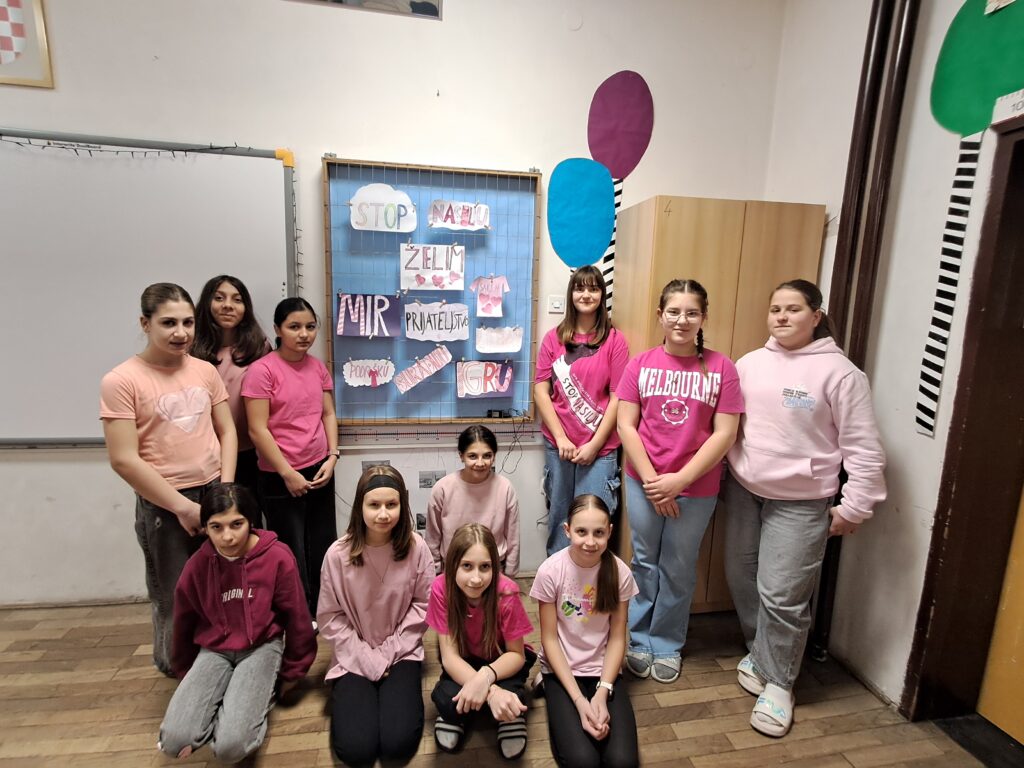 Prvi put smo se u ružičastom okupili zadnje srijede u veljači 2014. godine kada smo obilježili prvi Dan ružičastih majica u Hrvatskoj. Bili smo jedna od rijetkih škola koje su toga dana ustale protiv nasilja, a jučer smo trinaesti put obilježili ovaj Nacionalni dan borbe protiv vršnjačkog nasilja.
