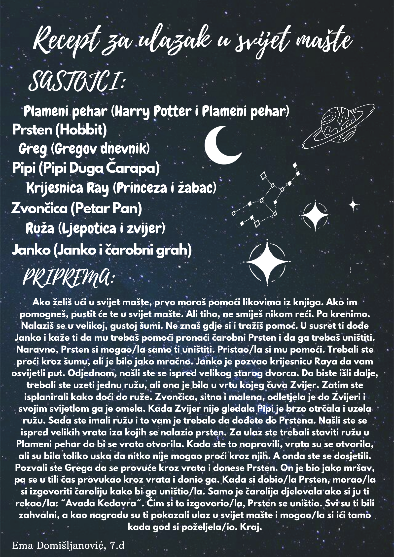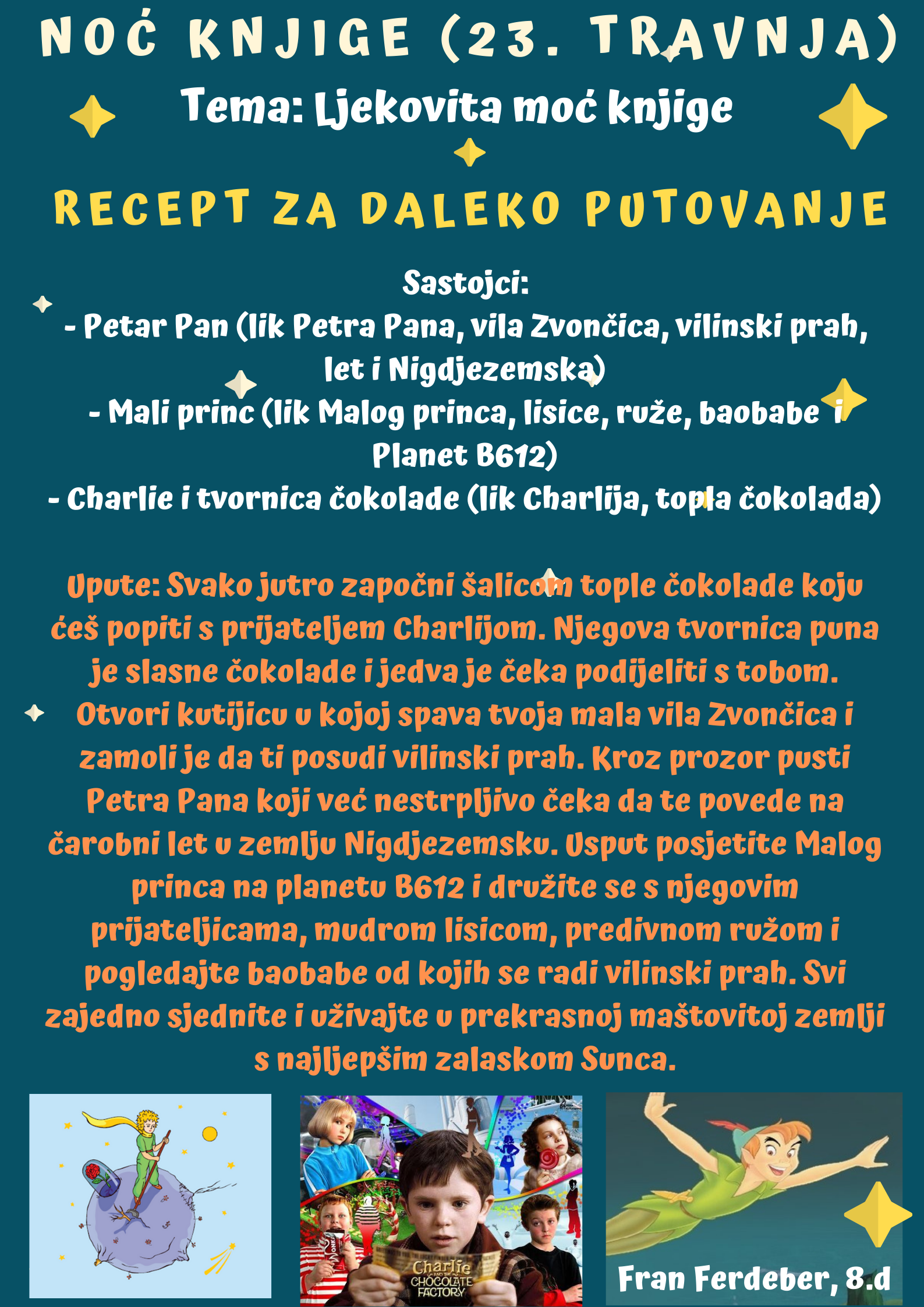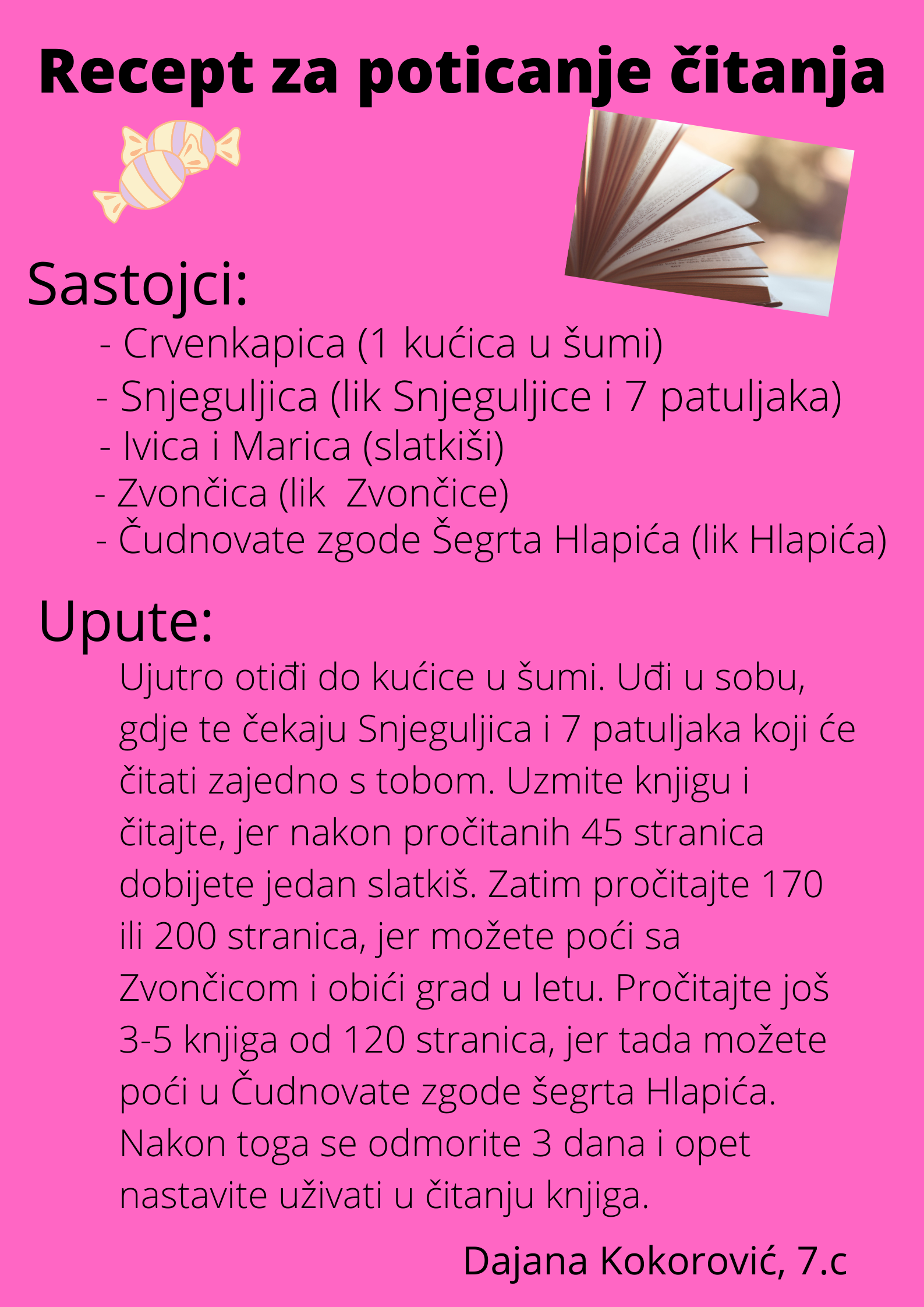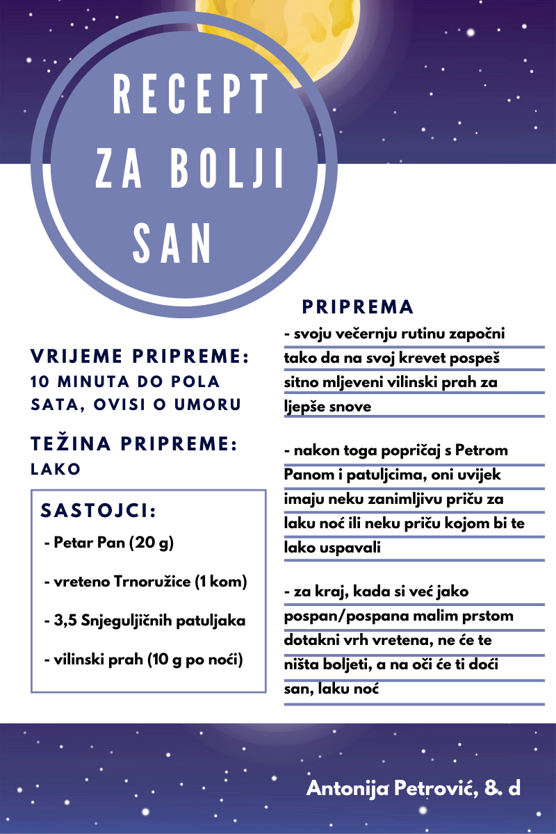 Učenici su dobili upute da osmisle recept u kojem će koristiti sastojke iz knjiga koje su pročitali. U opisu pripreme svakog recepta stvarali su nove zanimljive priče kao samopomoć drugima. Napisali su recepte u kojima su glavni sastojci motivi iz knjiga koristeći se digitalnim alatom Canva.
