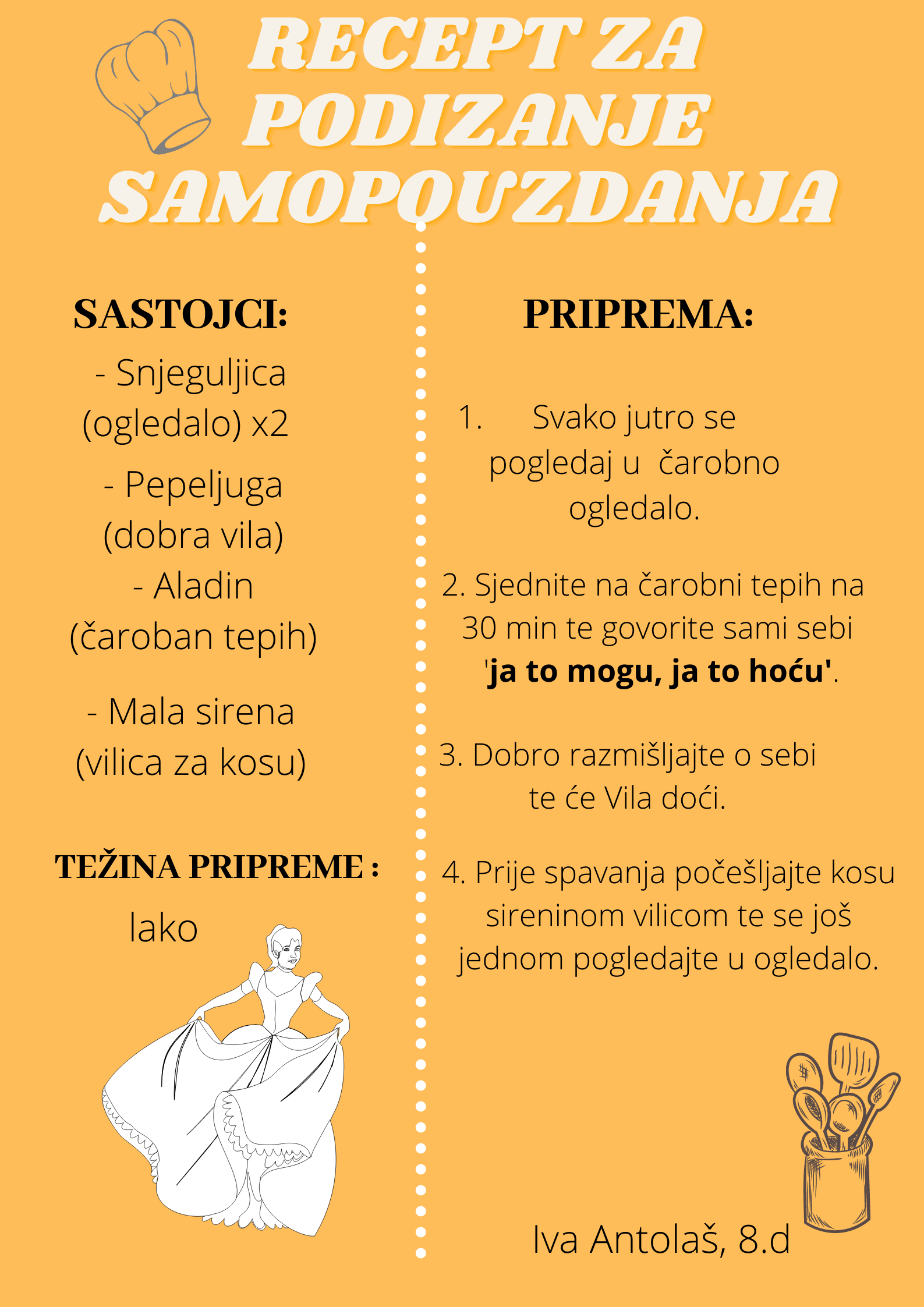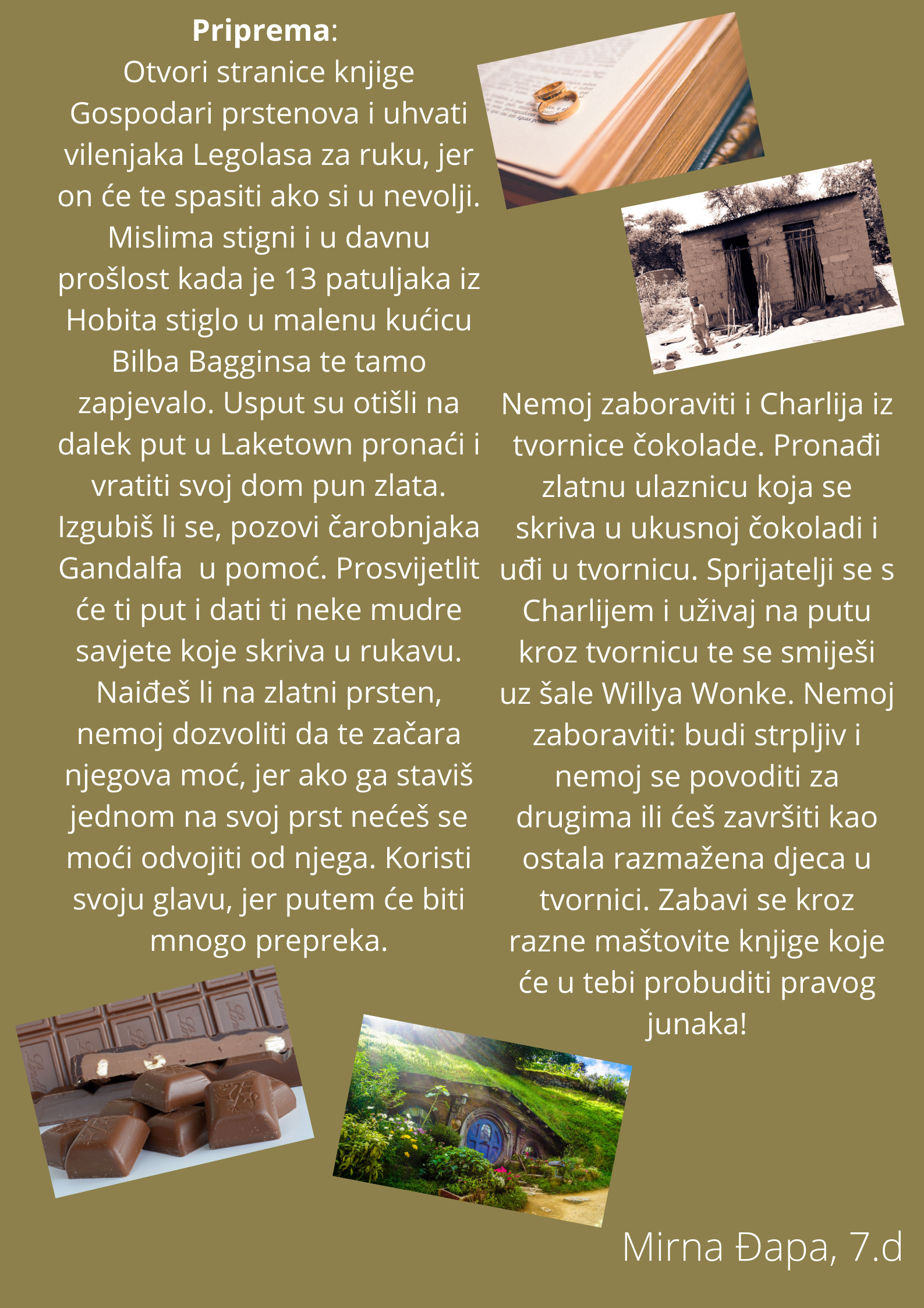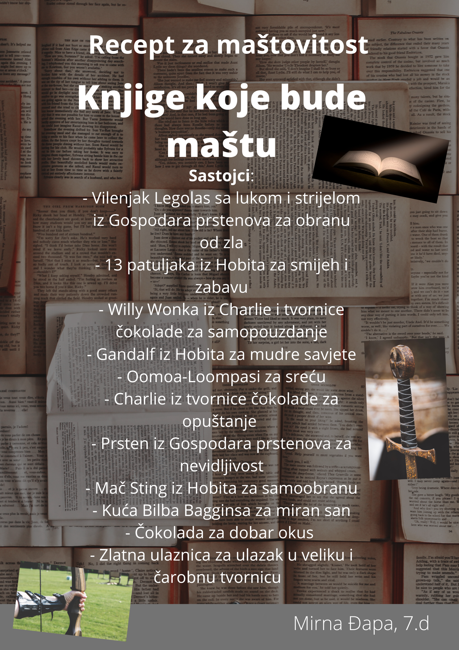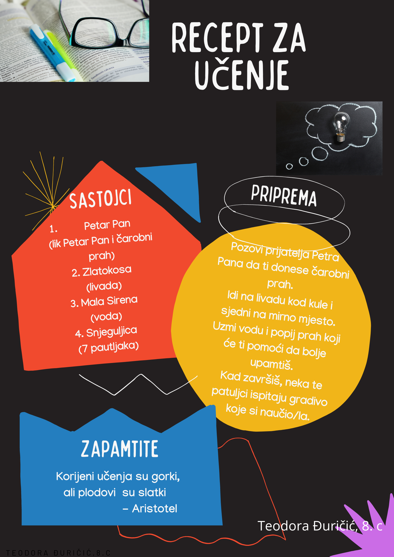 Učenici su dobili upute da osmisle recept u kojem će koristiti sastojke iz knjiga koje su pročitali. U opisu pripreme svakog recepta stvarali su nove zanimljive priče kao samopomoć drugima. Napisali su recepte u kojima su glavni sastojci motivi iz knjiga koristeći se digitalnim alatom Canva.
