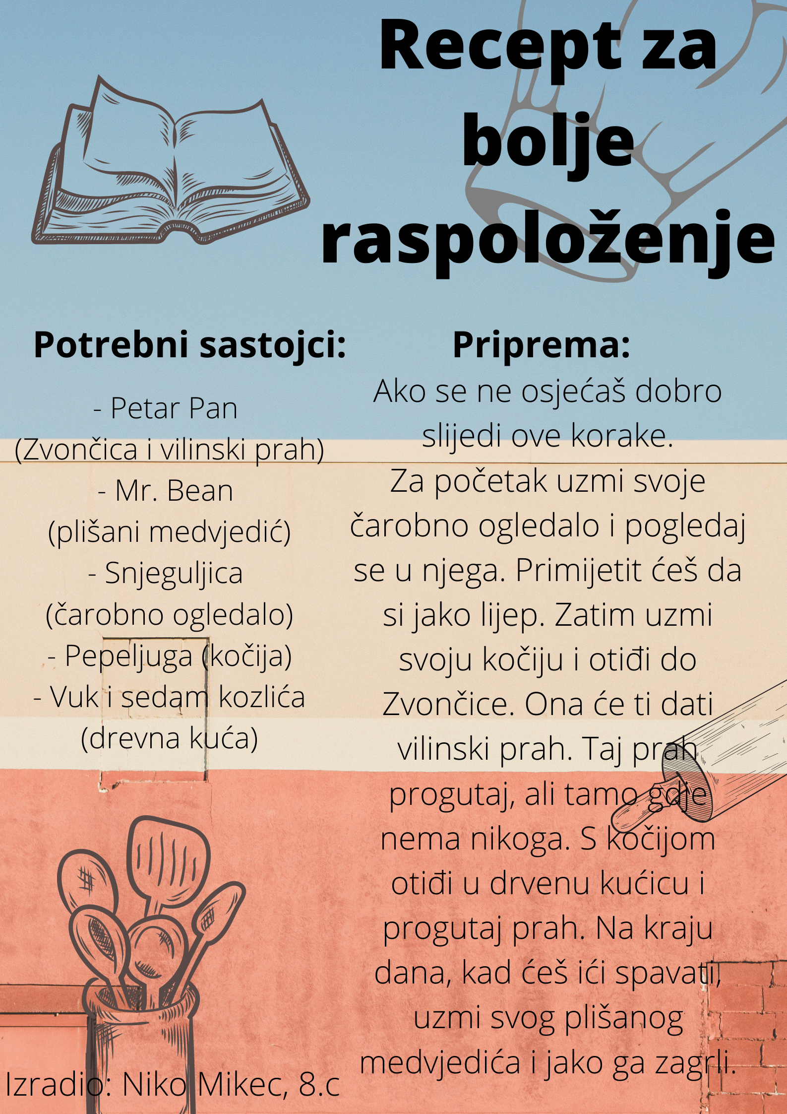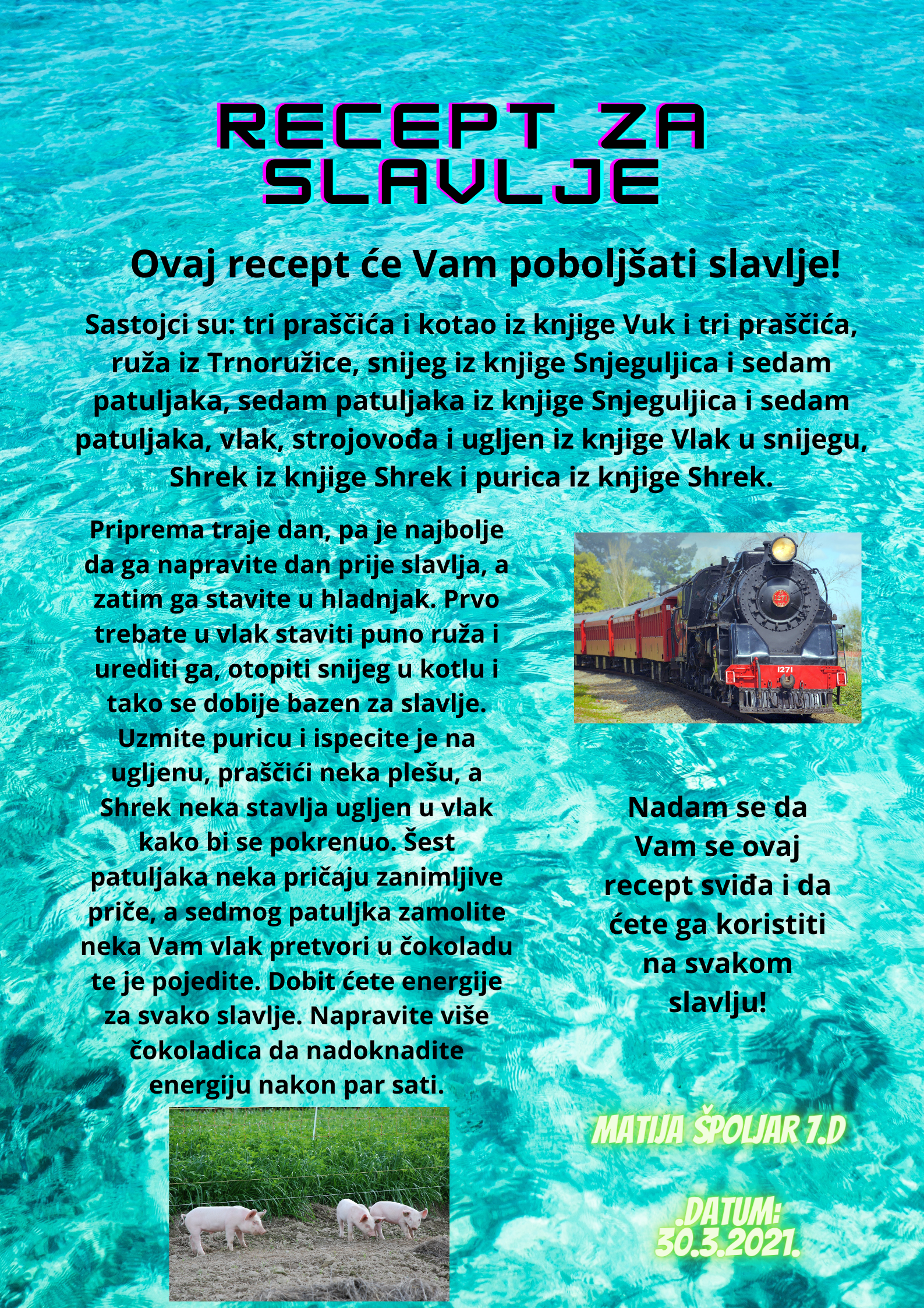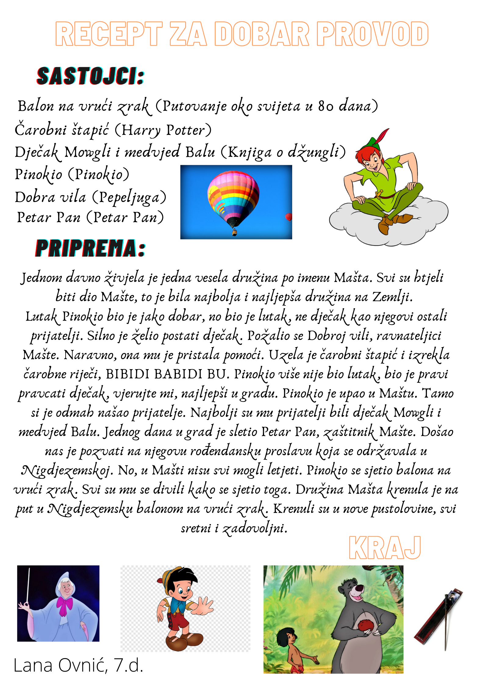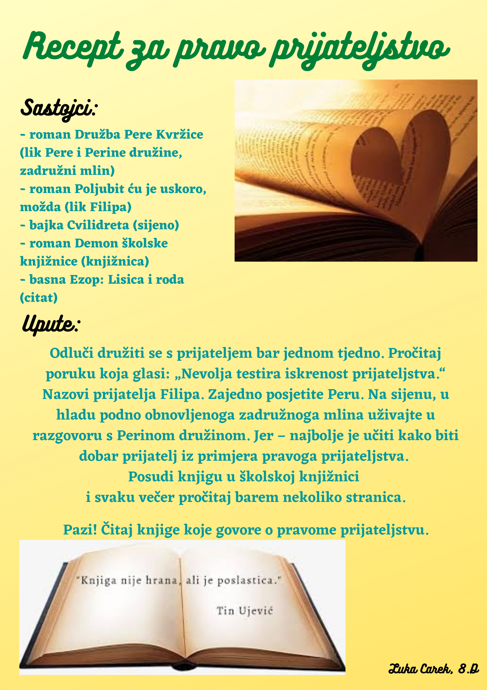 Učenici su dobili upute da osmisle recept u kojem će koristiti sastojke iz knjiga koje su pročitali. U opisu pripreme svakog recepta stvarali su nove zanimljive priče kao samopomoć drugima. Napisali su recepte u kojima su glavni sastojci motivi iz knjiga koristeći se digitalnim alatom Canva.