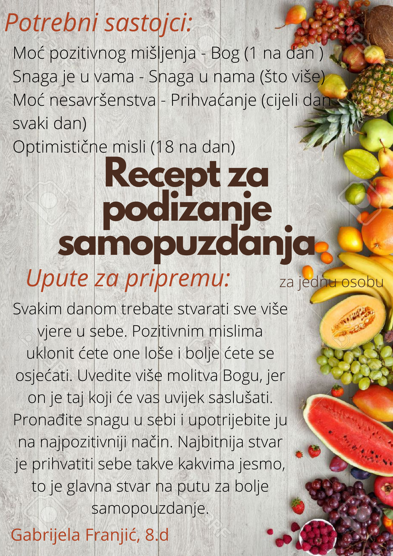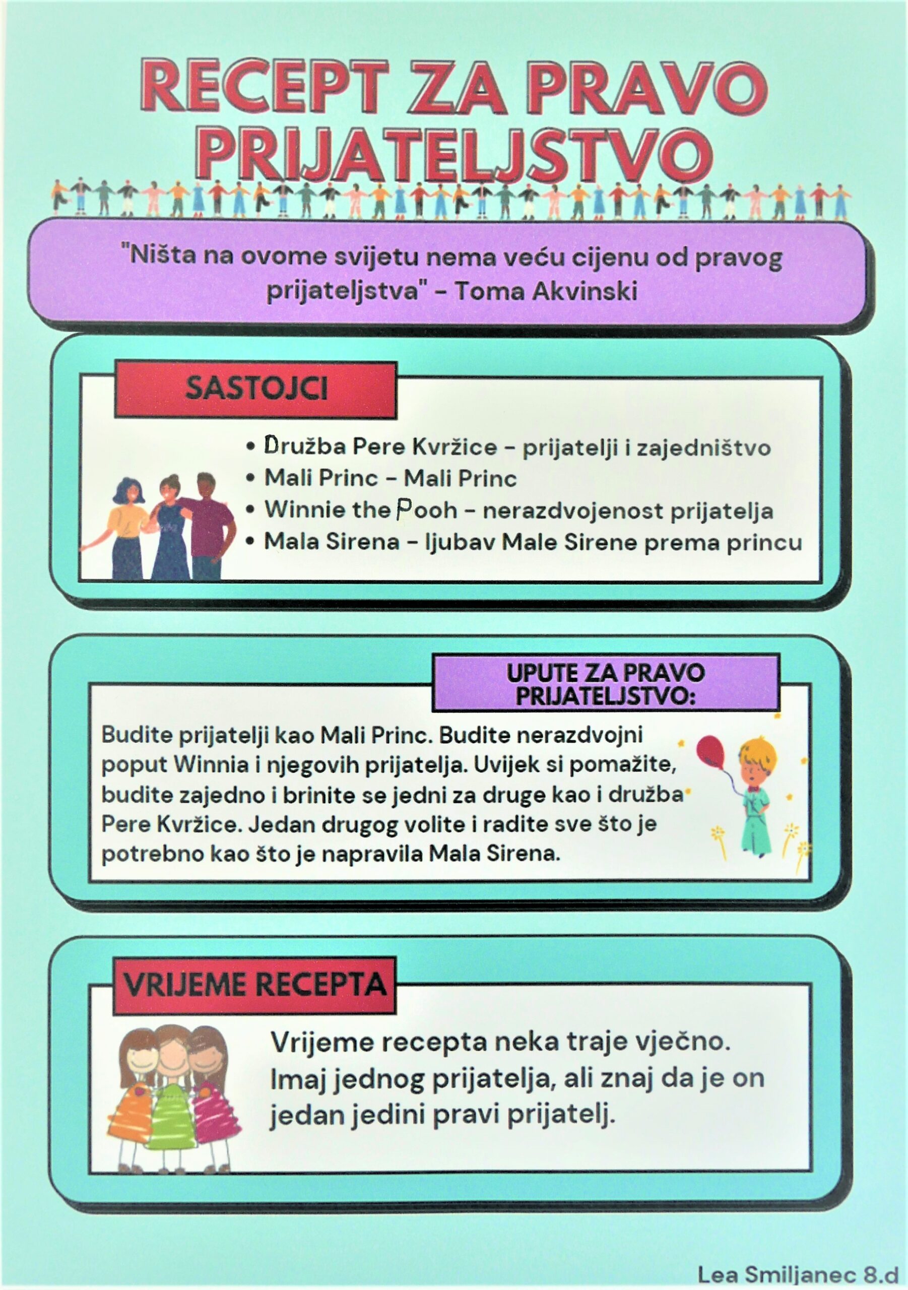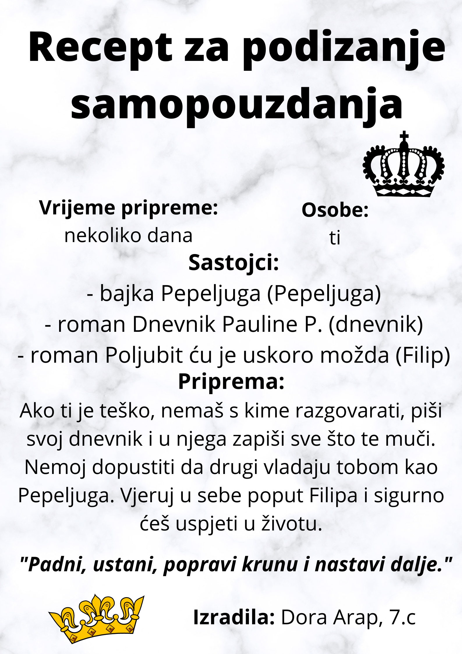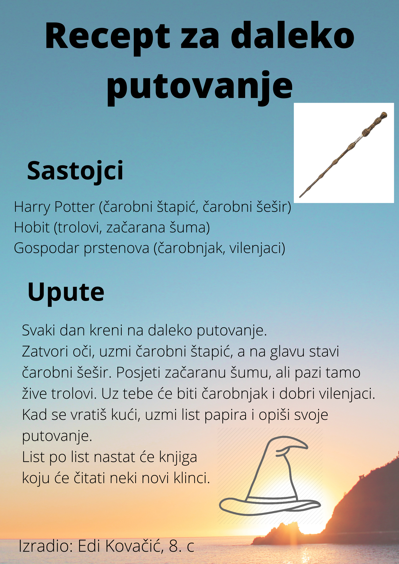 Učenici su dobili upute da osmisle recept u kojem će koristiti sastojke iz knjiga koje su pročitali. U opisu pripreme svakog recepta stvarali su nove zanimljive priče kao samopomoć drugima. Napisali su recepte u kojima su glavni sastojci motivi iz knjiga koristeći se digitalnim alatom Canva.