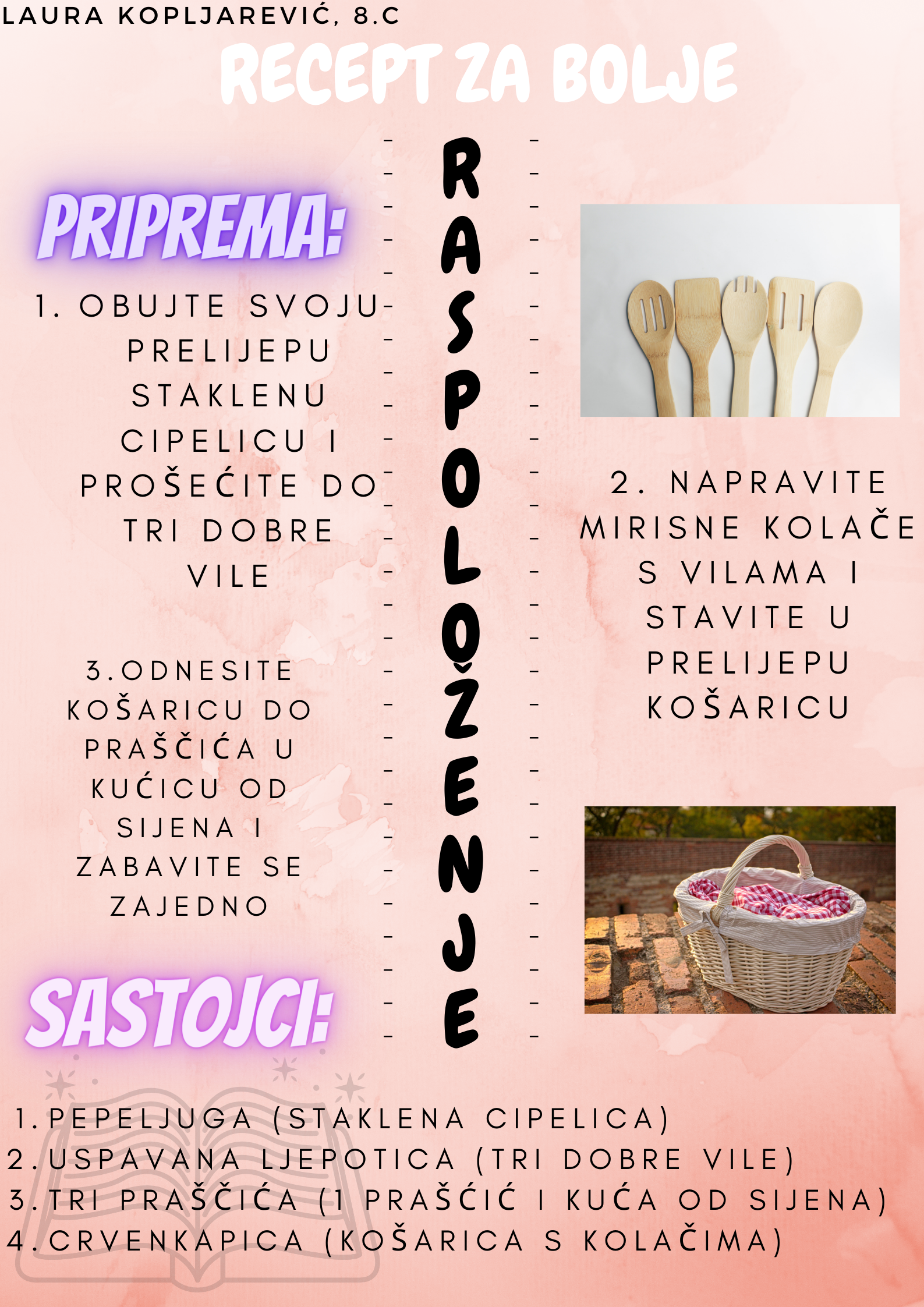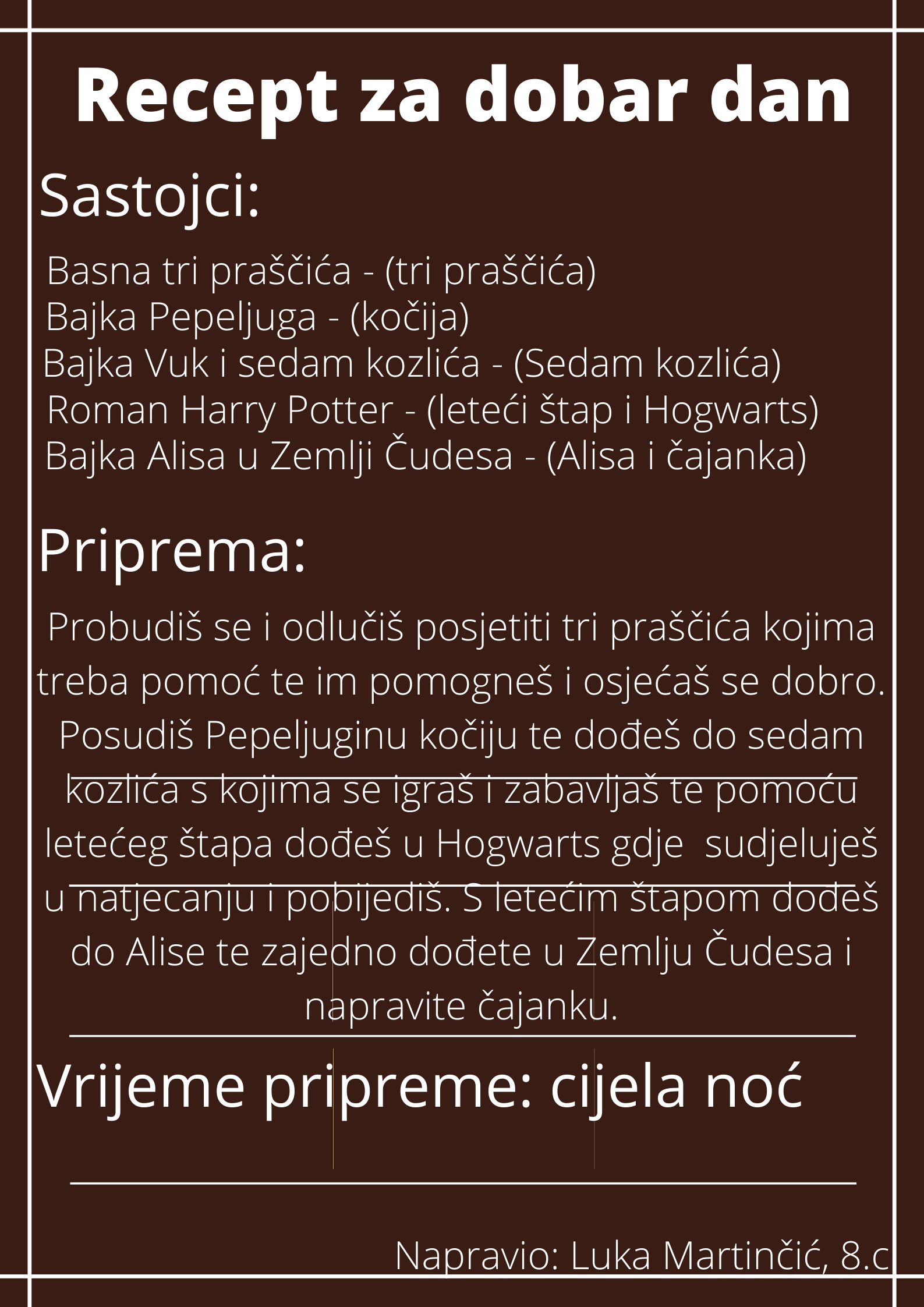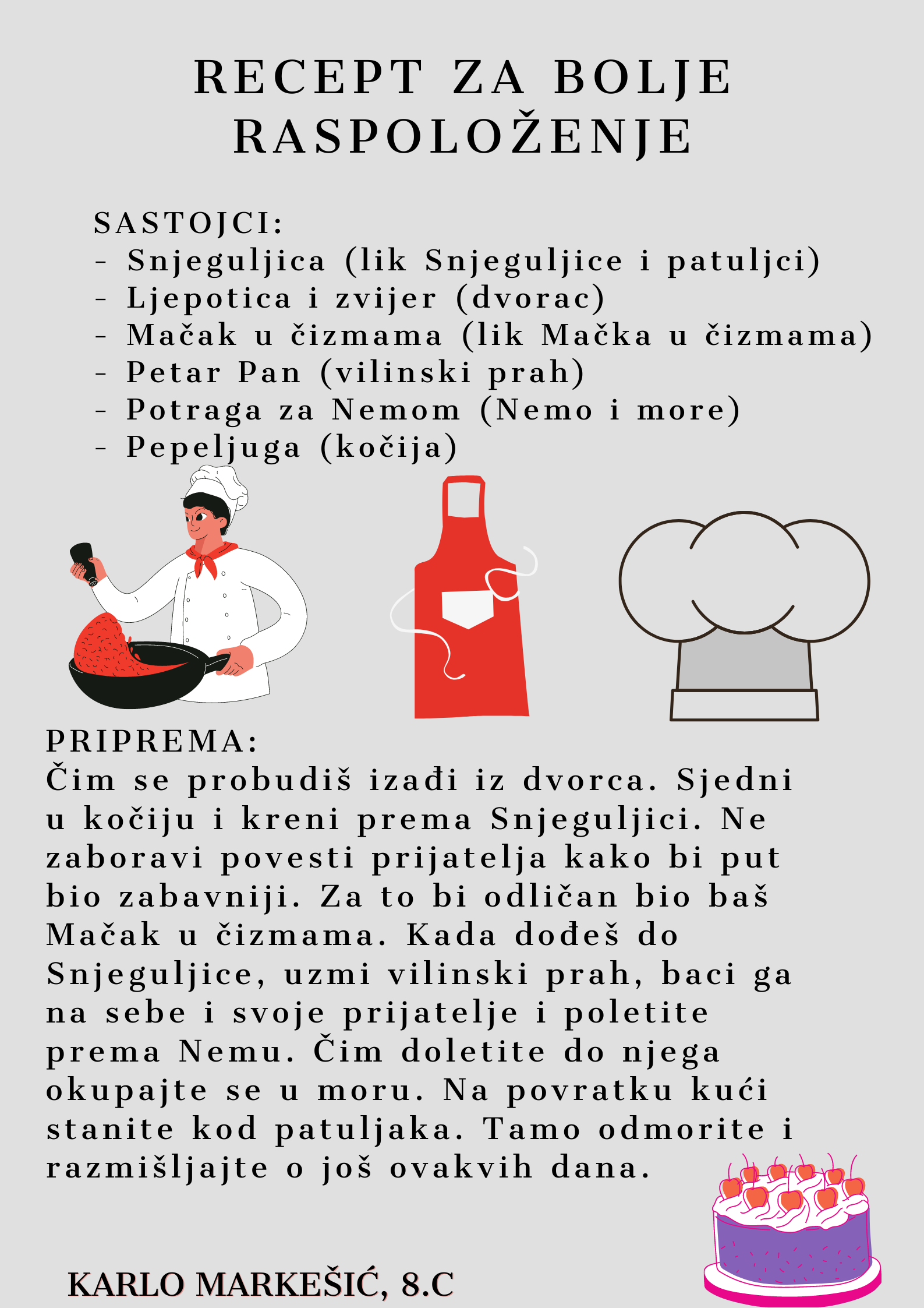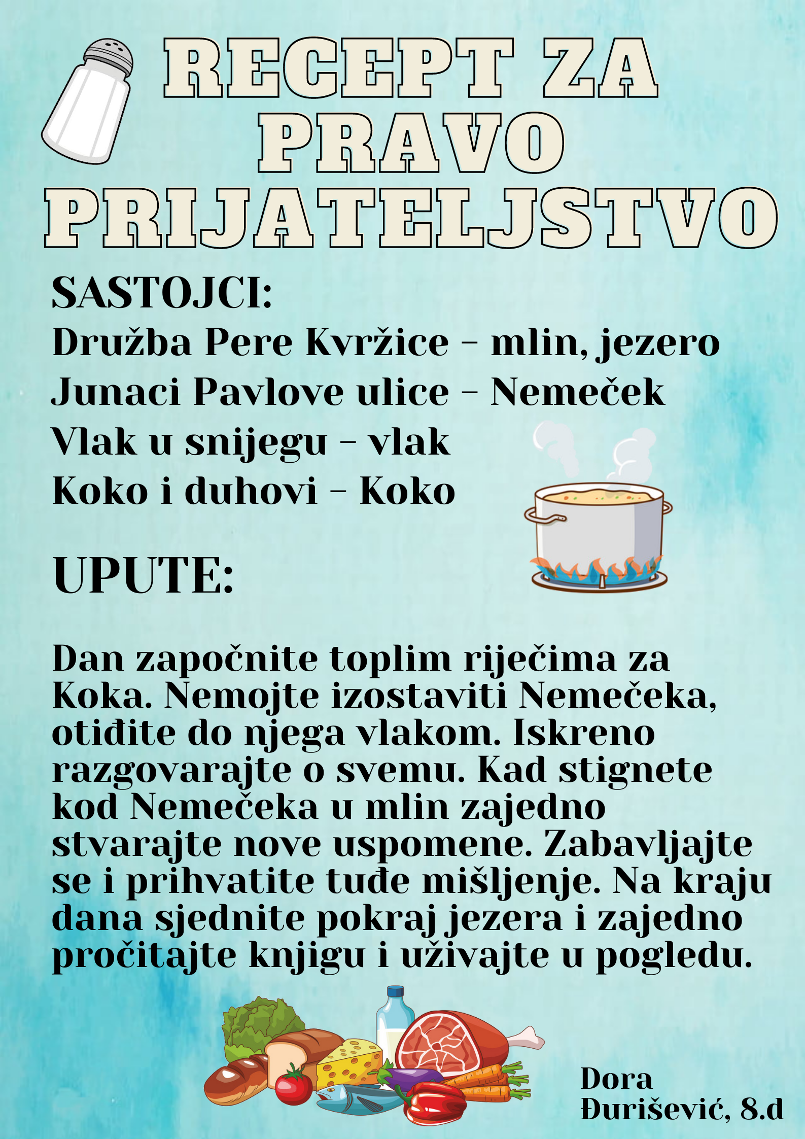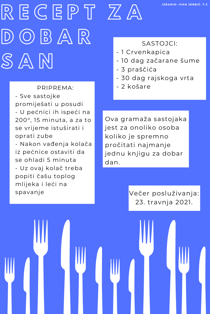 Učenici su dobili upute da osmisle recept u kojem će koristiti sastojke iz knjiga koje su pročitali. U opisu pripreme svakog recepta stvarali su nove zanimljive priče kao samopomoć drugima. Napisali su recepte u kojima su glavni sastojci motivi iz knjiga koristeći se digitalnim alatom Canva.