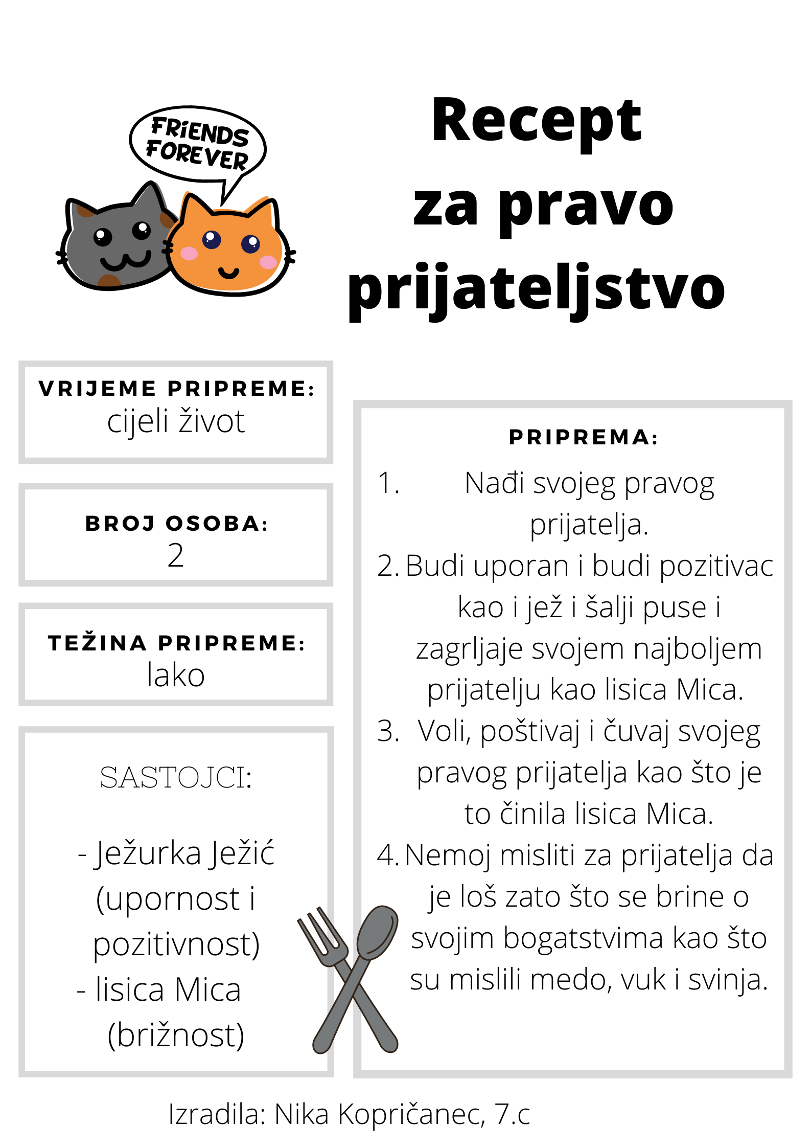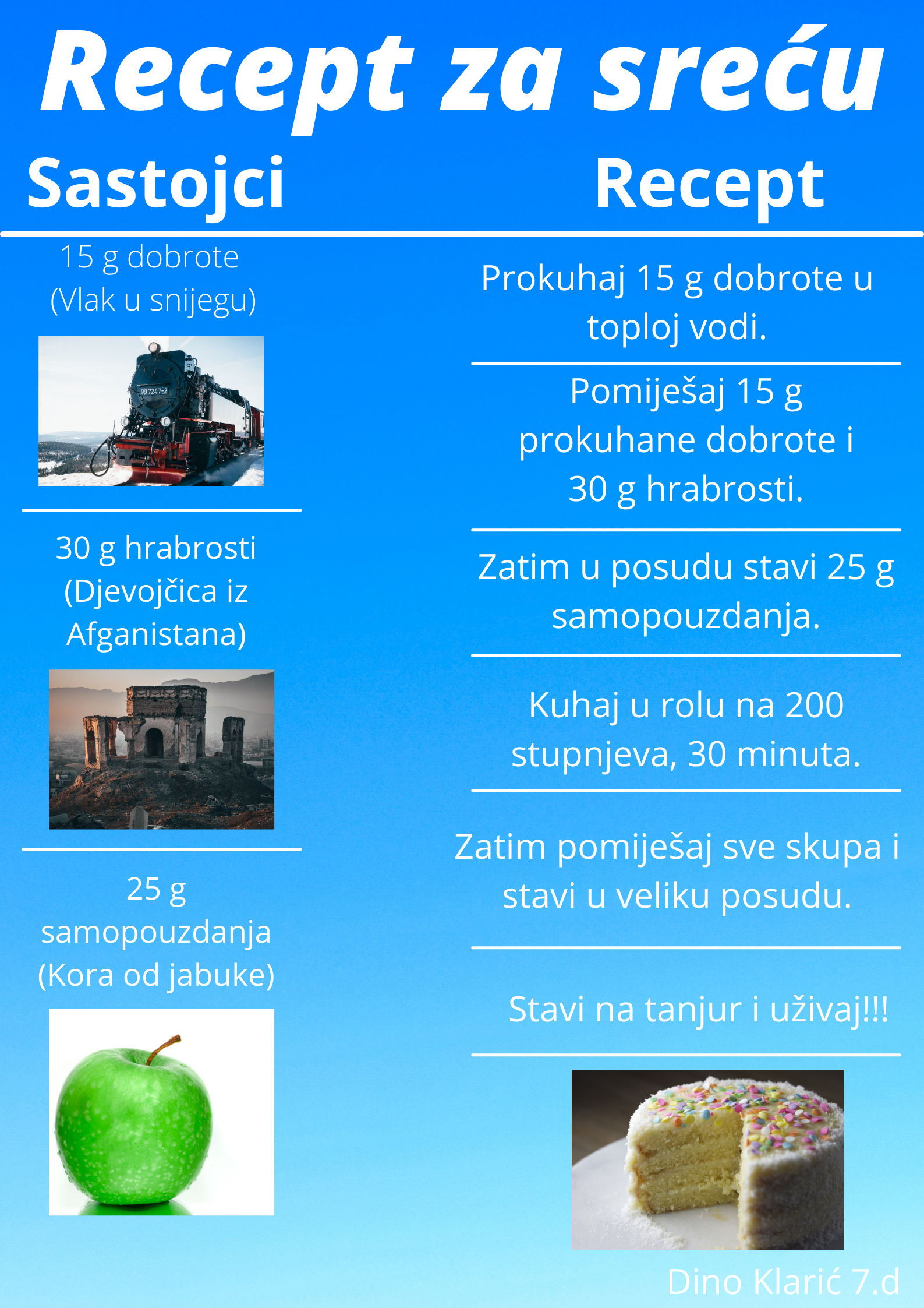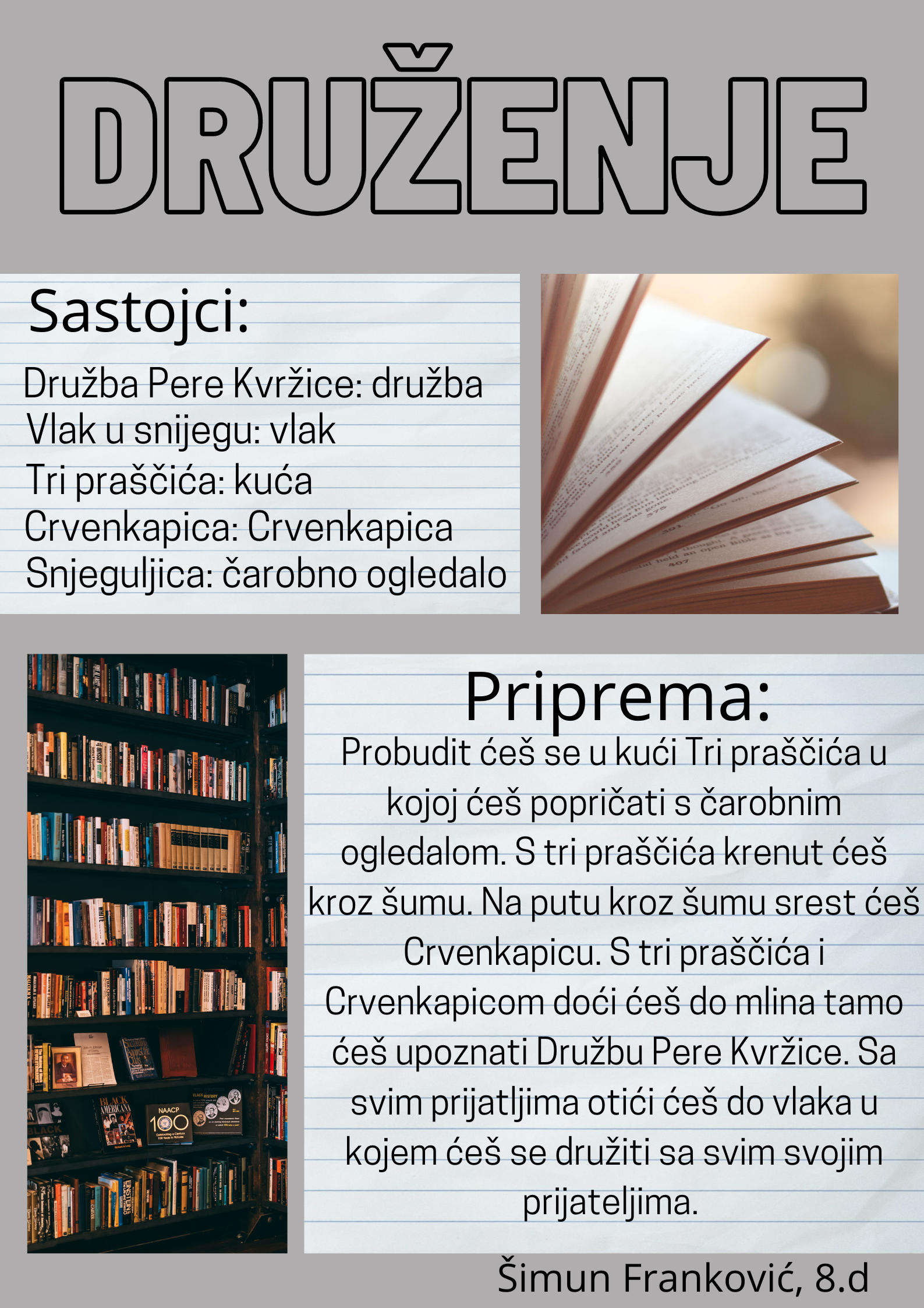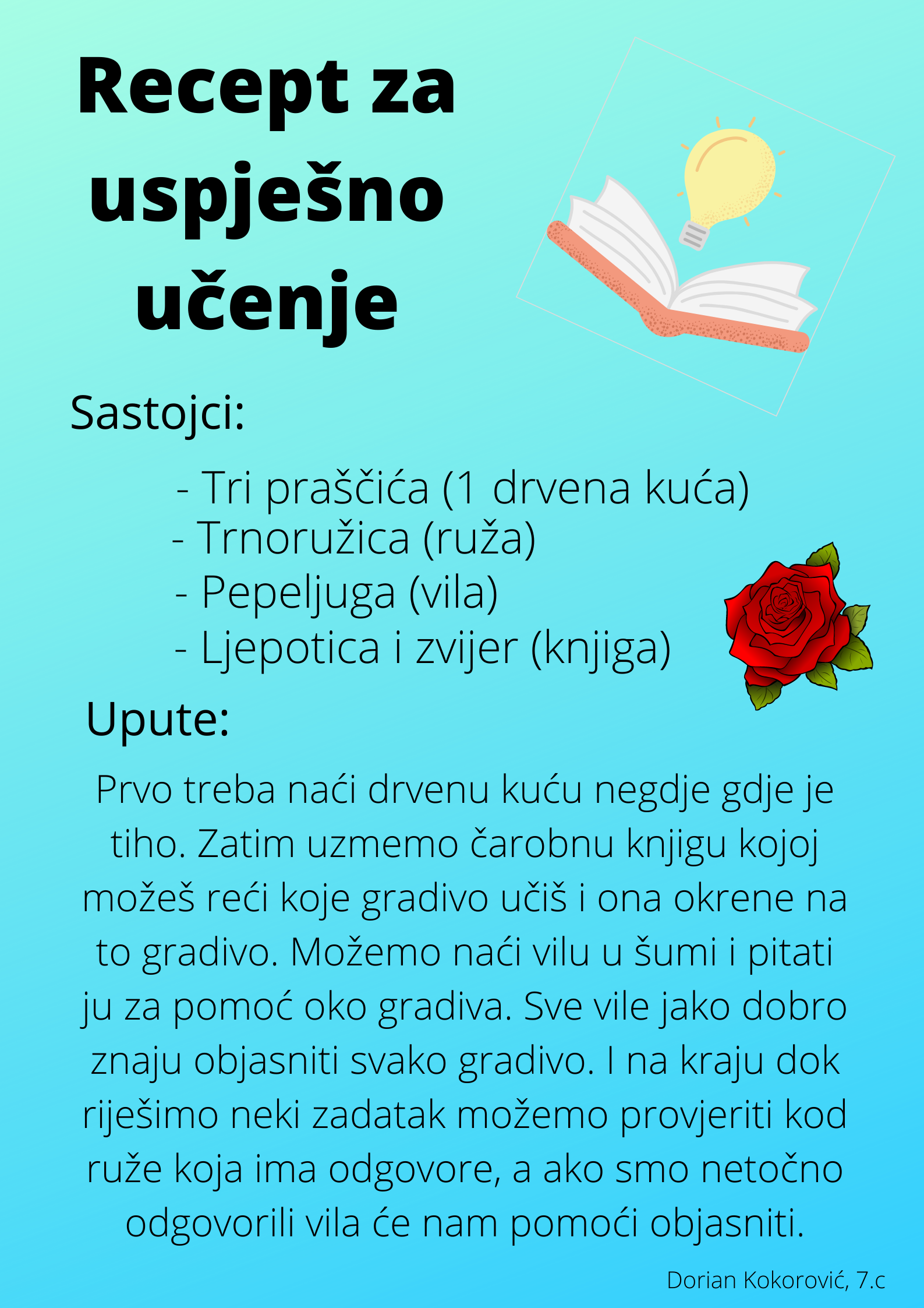 Učenici su dobili upute da osmisle recept u kojem će koristiti sastojke iz knjiga koje su pročitali. U opisu pripreme svakog recepta stvarali su nove zanimljive priče kao samopomoć drugima. Napisali su recepte u kojima su glavni sastojci motivi iz knjiga koristeći se digitalnim alatom Canva.