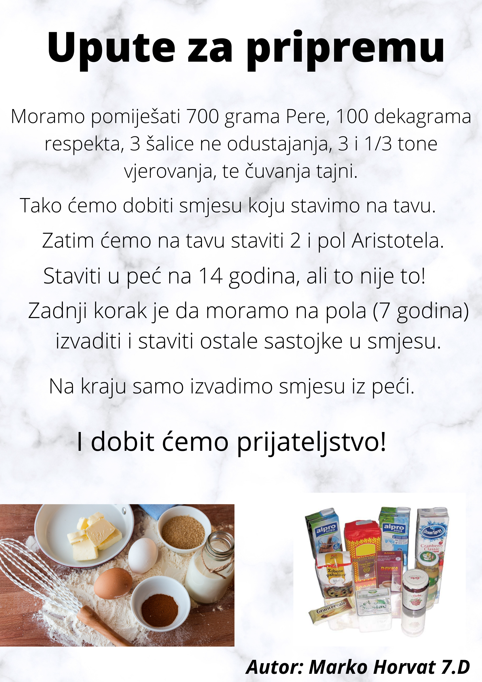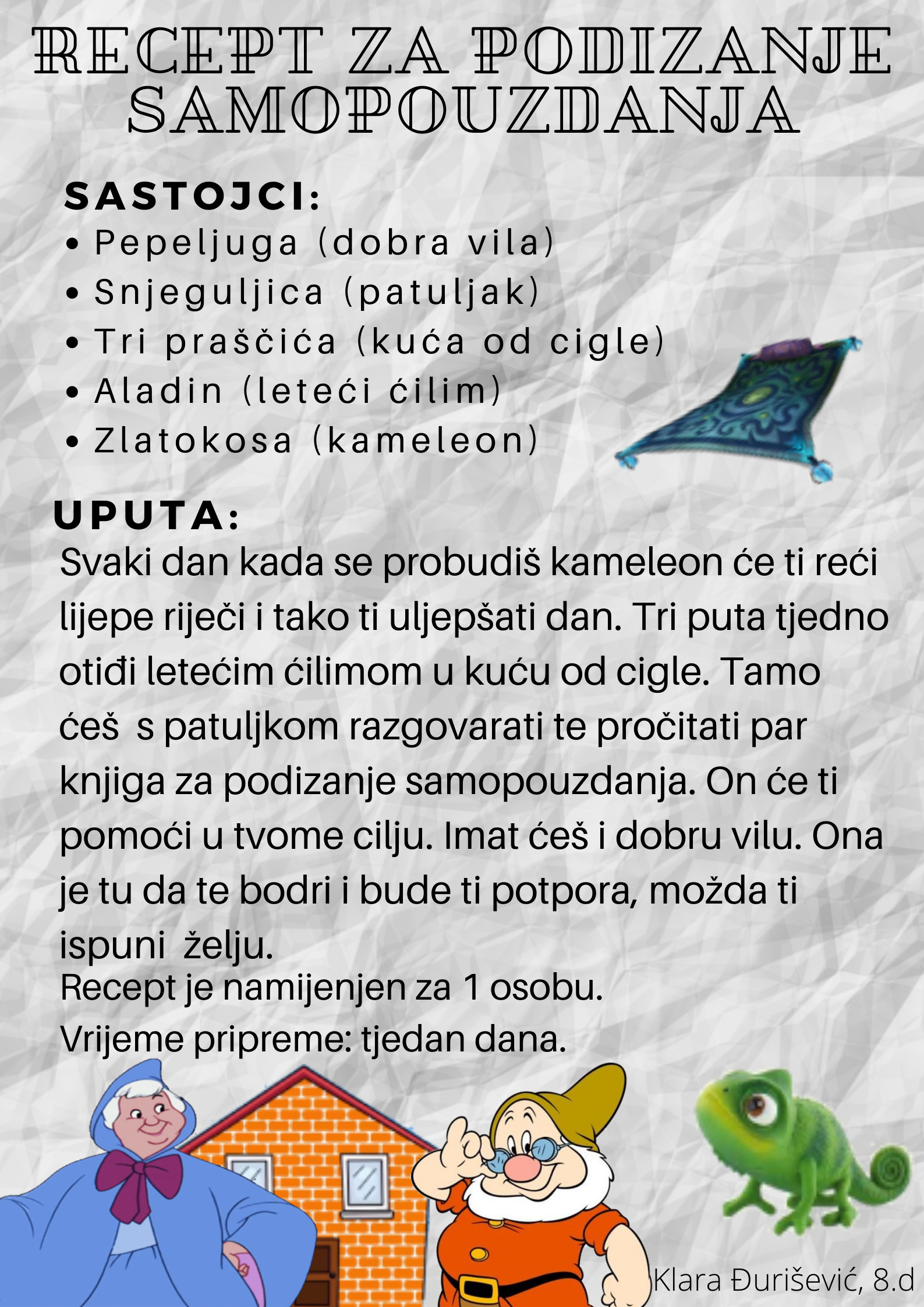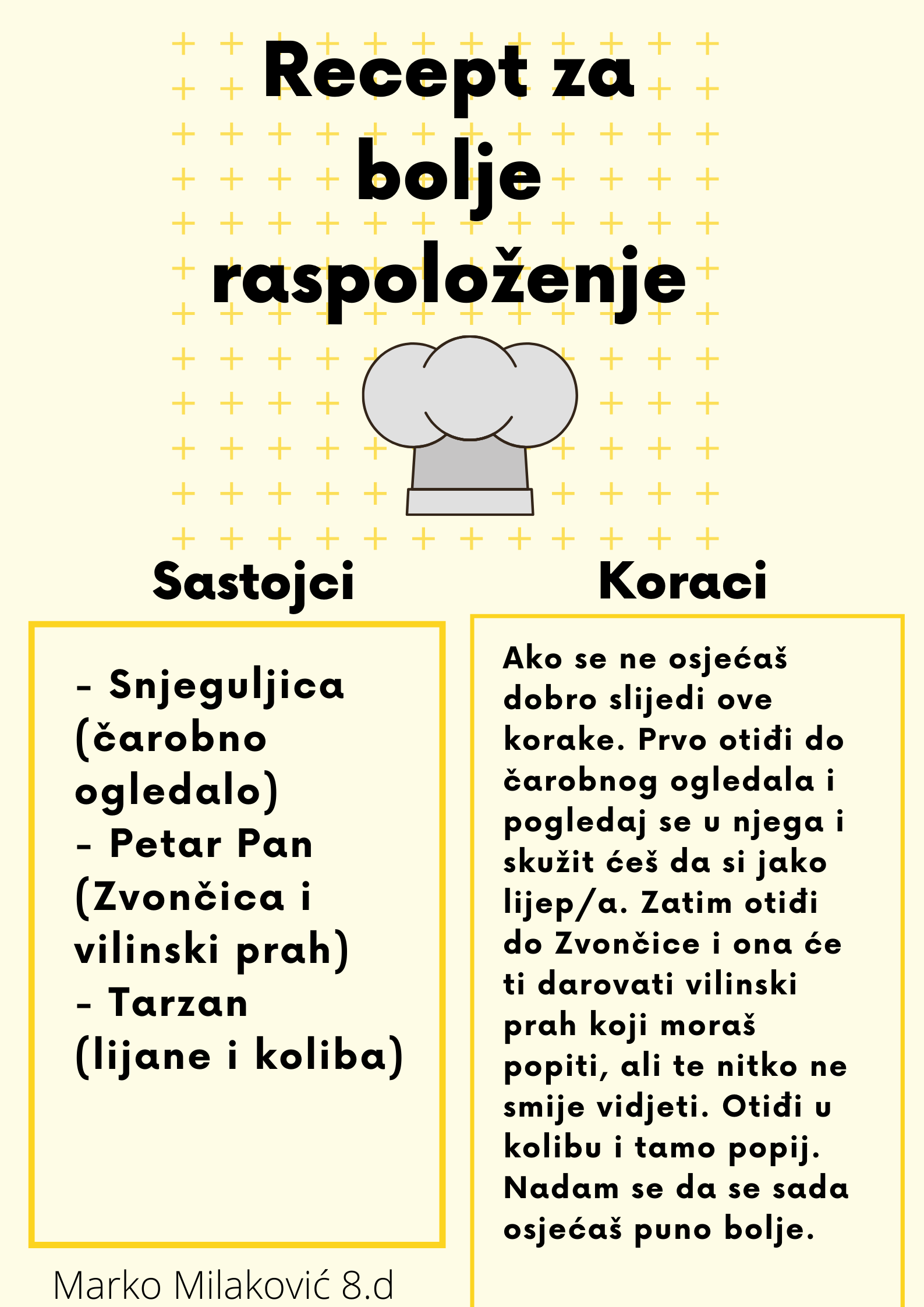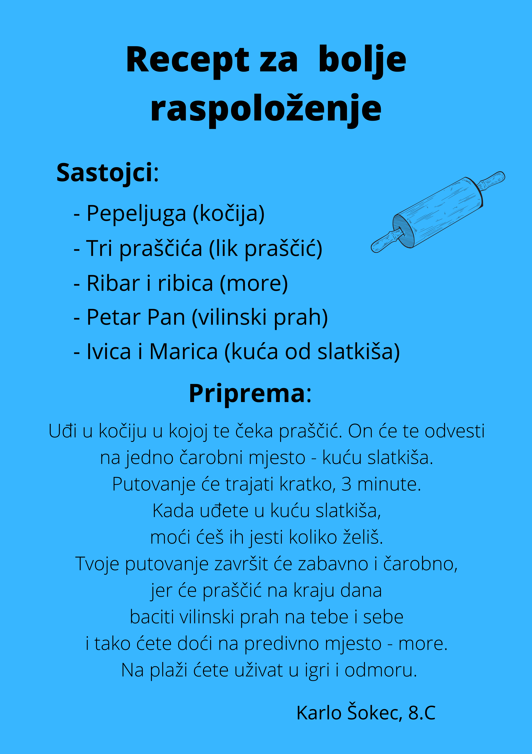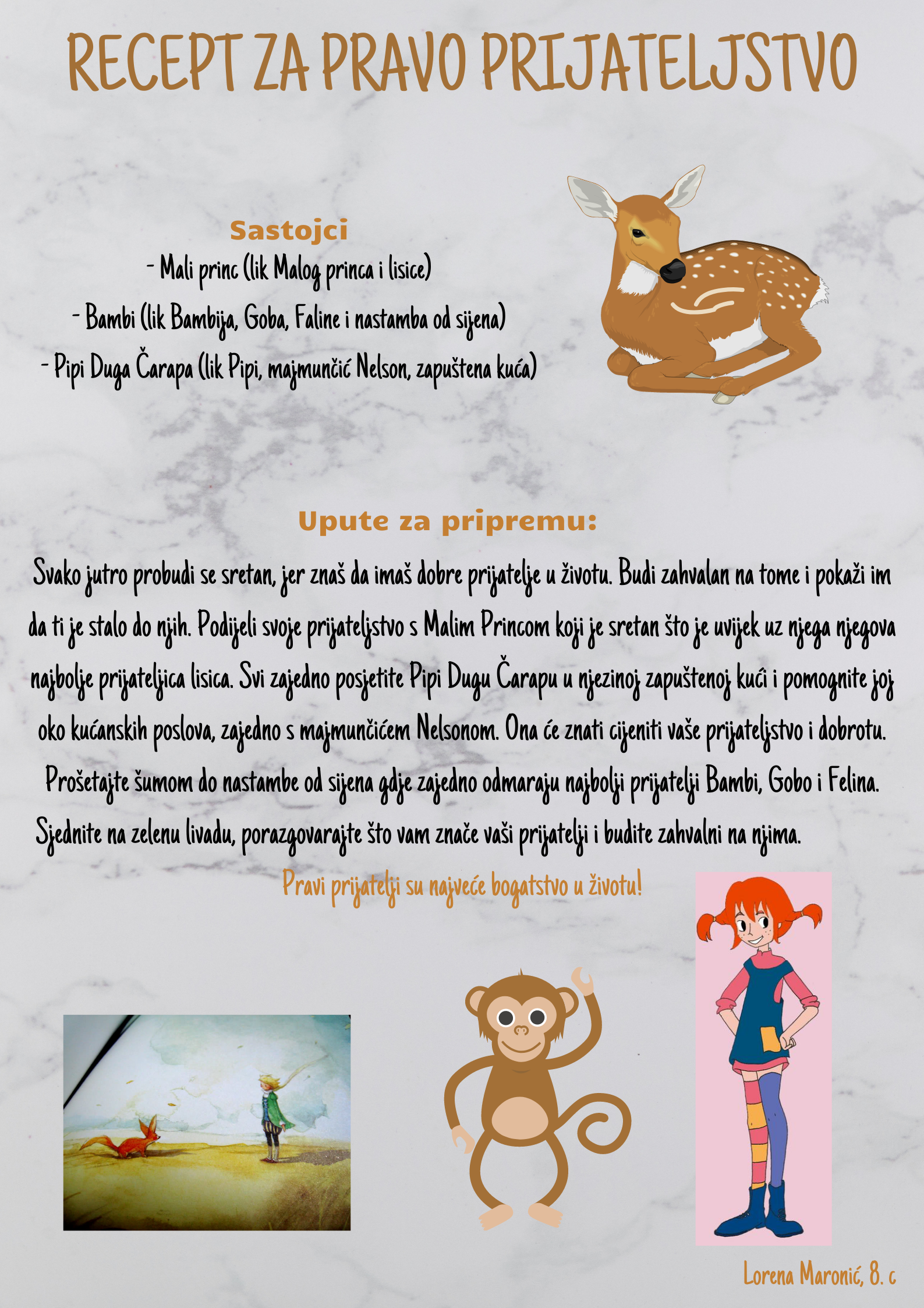 Učenici su dobili upute da osmisle recept u kojem će koristiti sastojke iz knjiga koje su pročitali. U opisu pripreme svakog recepta stvarali su nove zanimljive priče kao samopomoć drugima. Napisali su recepte u kojima su glavni sastojci motivi iz knjiga koristeći se digitalnim alatom Canva.