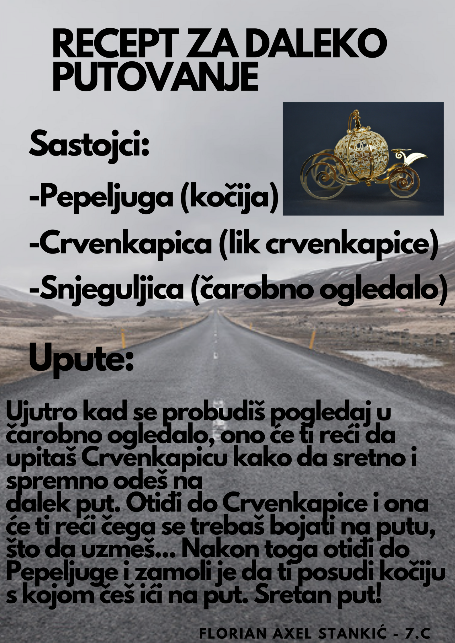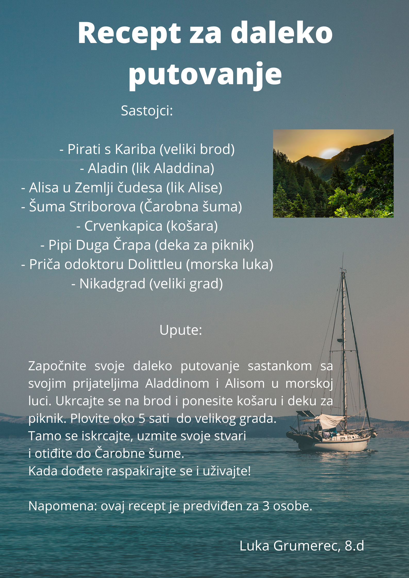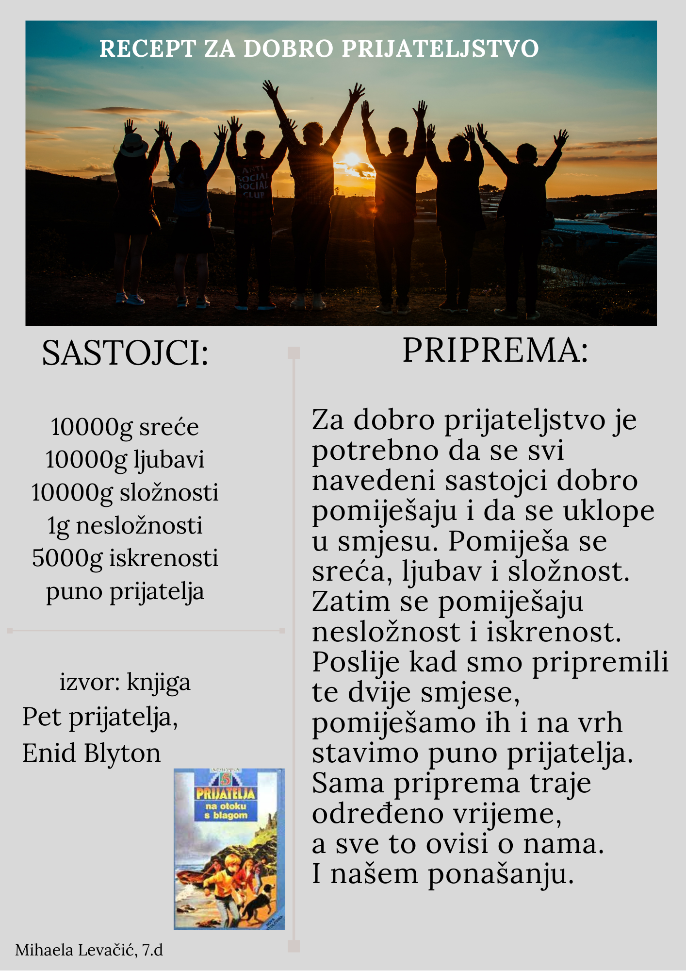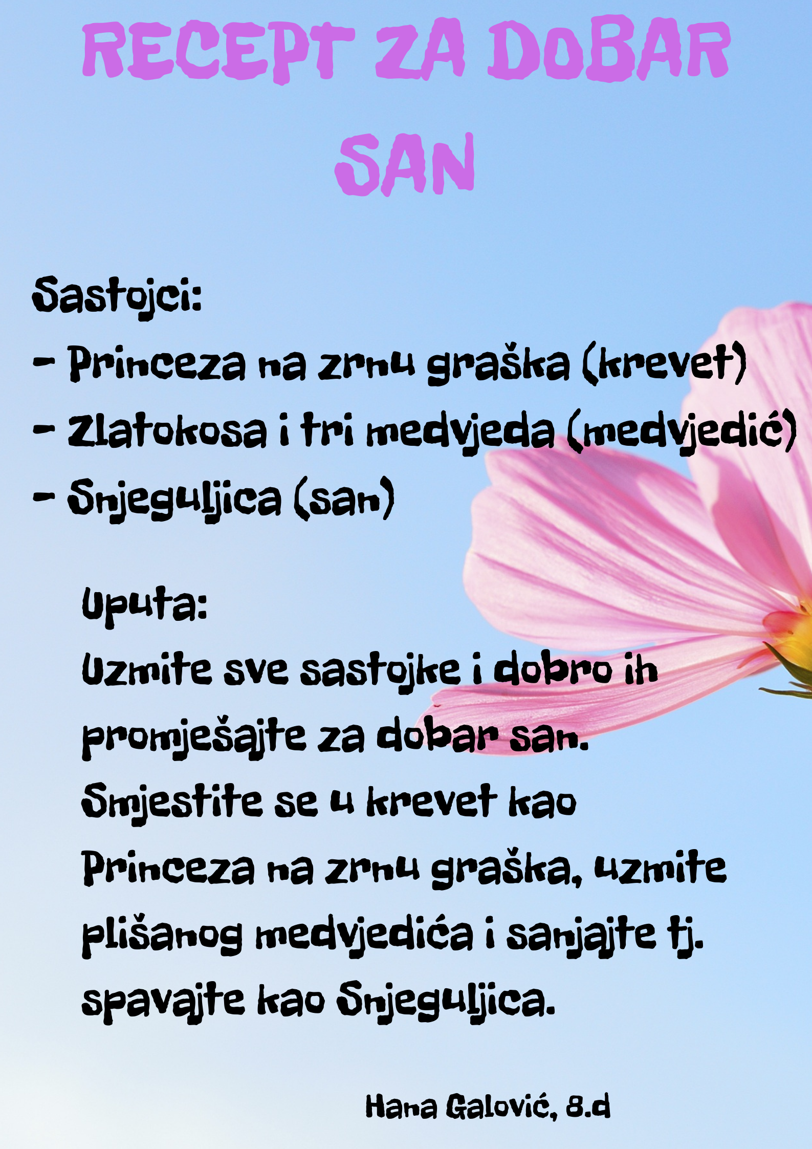 Učenici su dobili upute da osmisle recept u kojem će koristiti sastojke iz knjiga koje su pročitali. U opisu pripreme svakog recepta stvarali su nove zanimljive priče kao samopomoć drugima. Napisali su recepte u kojima su glavni sastojci motivi iz knjiga koristeći se digitalnim alatom Canva.