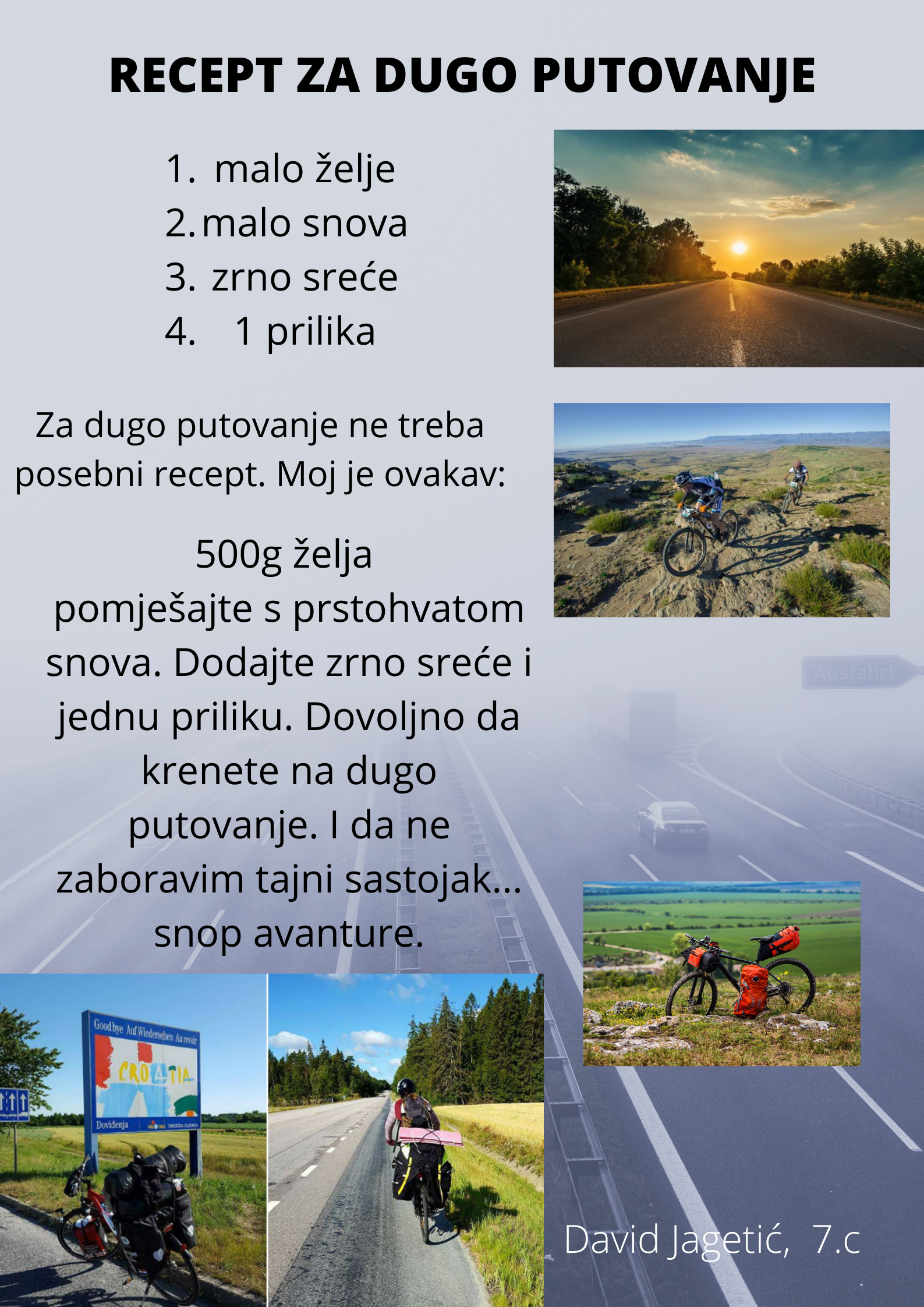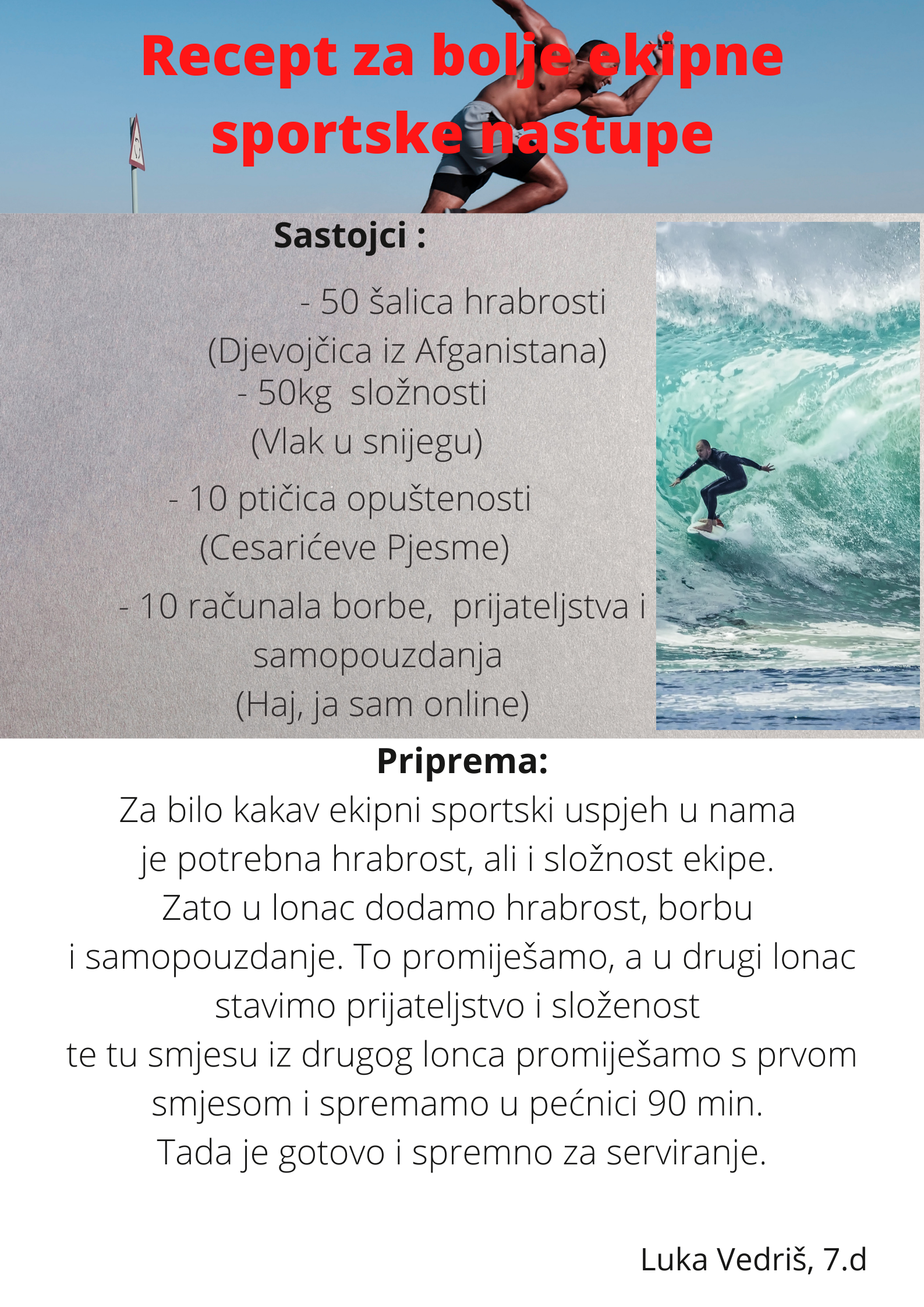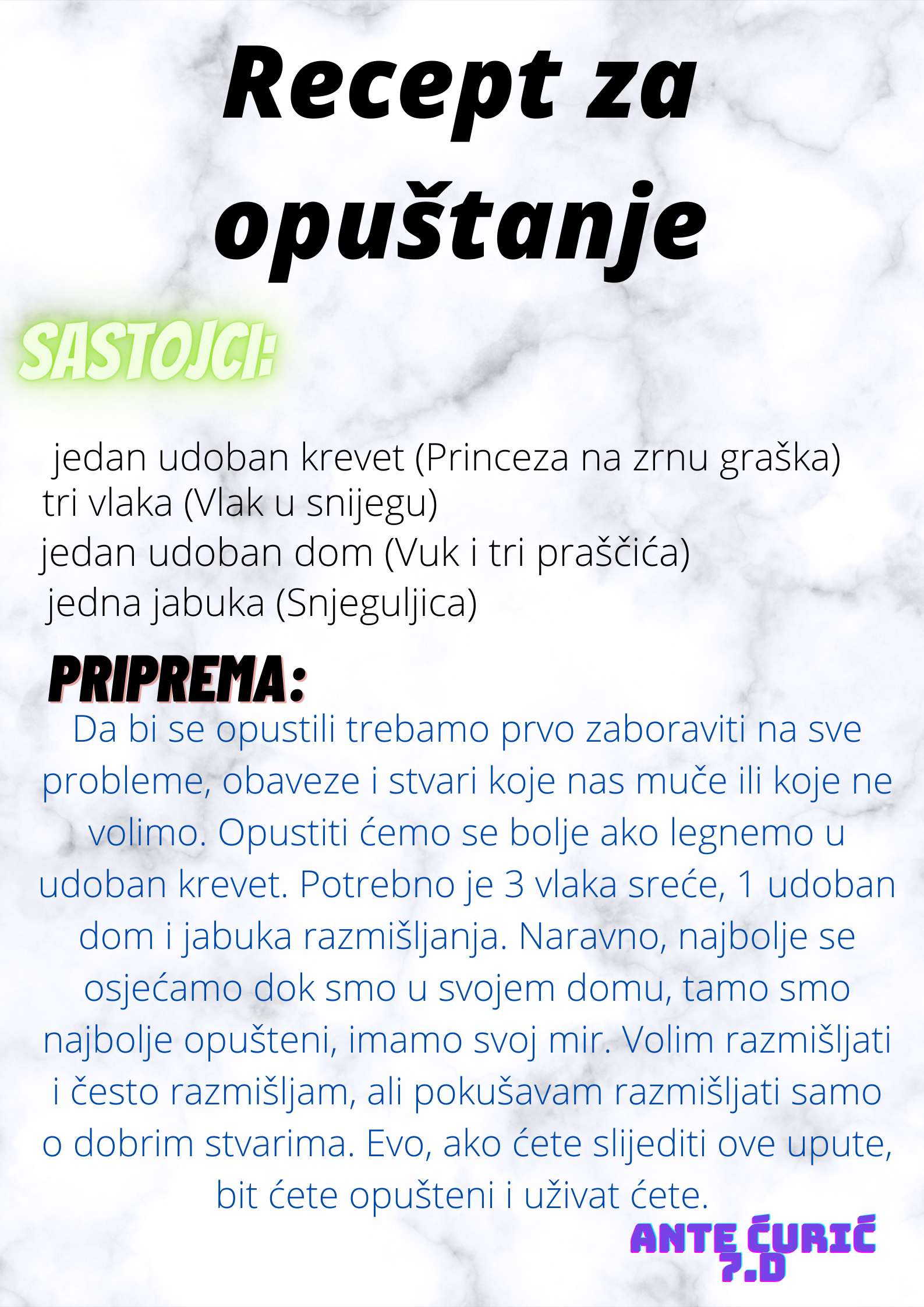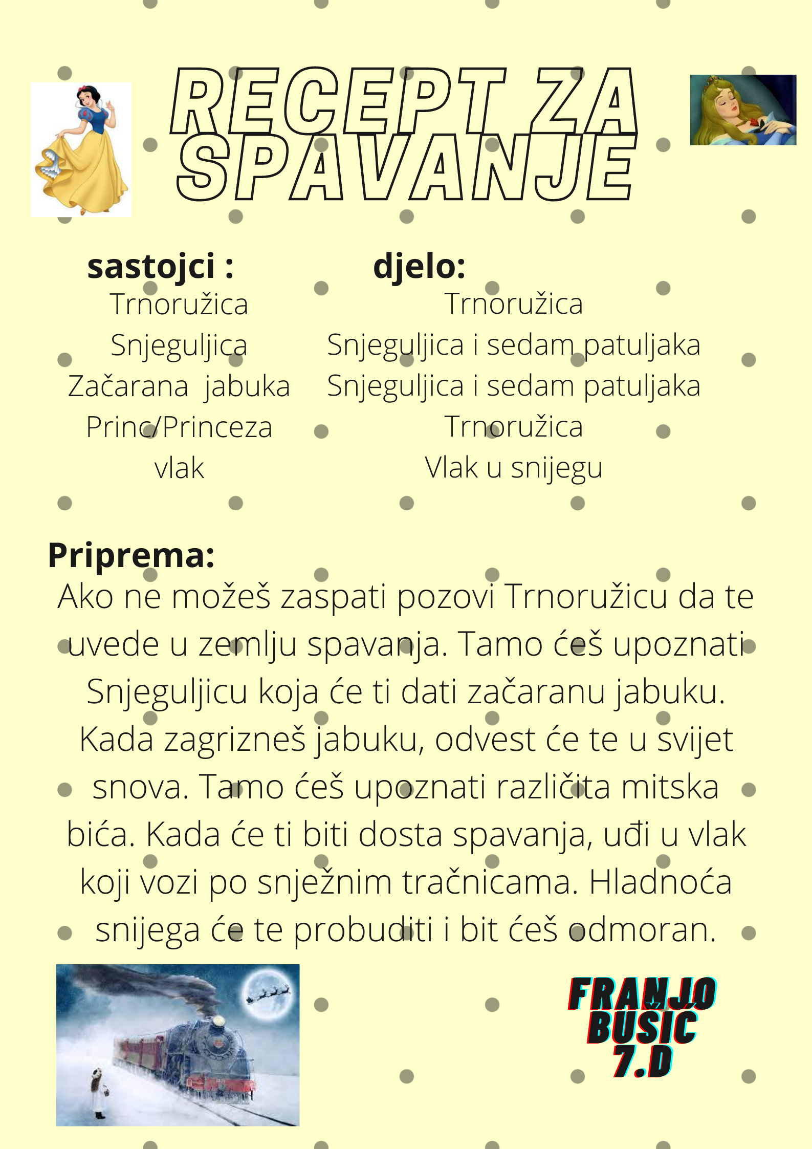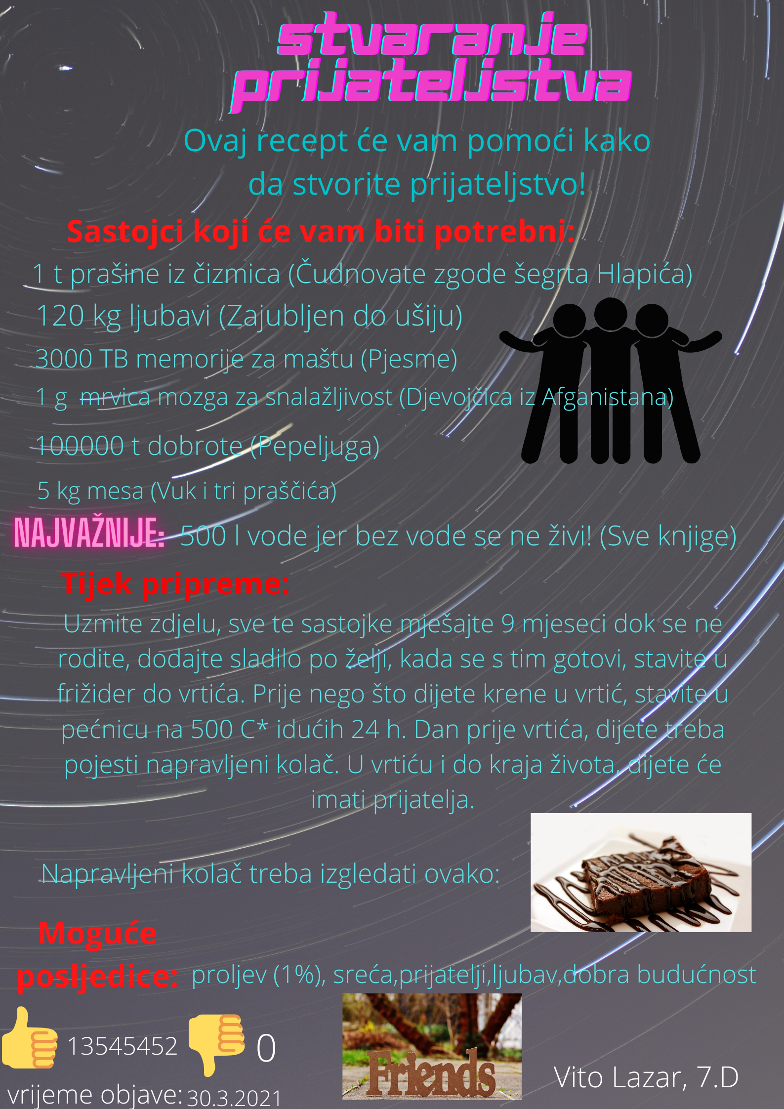 Učenici su dobili upute da osmisle recept u kojem će koristiti sastojke iz knjiga koje su pročitali. U opisu pripreme svakog recepta stvarali su nove zanimljive priče kao samopomoć drugima. Napisali su recepte u kojima su glavni sastojci motivi iz knjiga koristeći se digitalnim alatom Canva.
