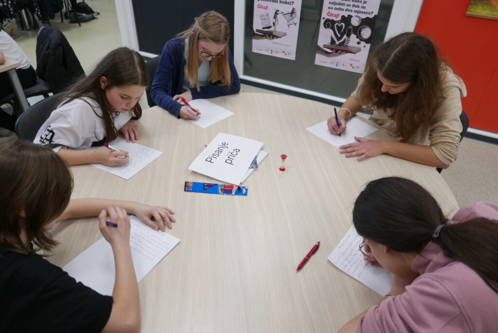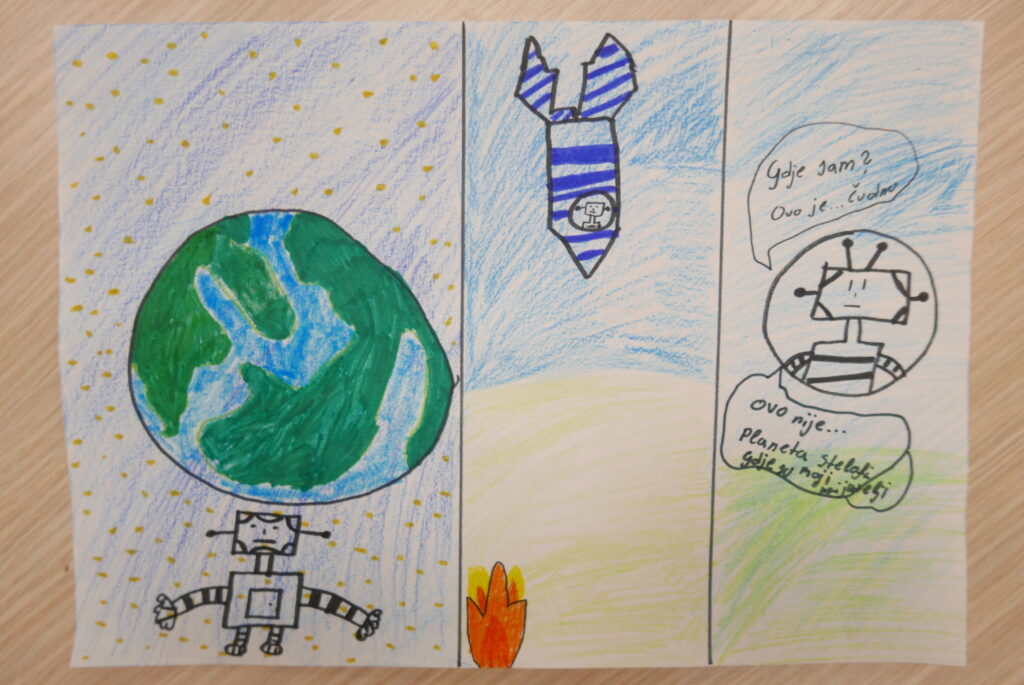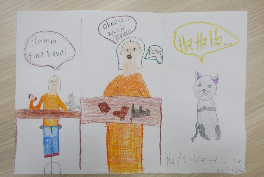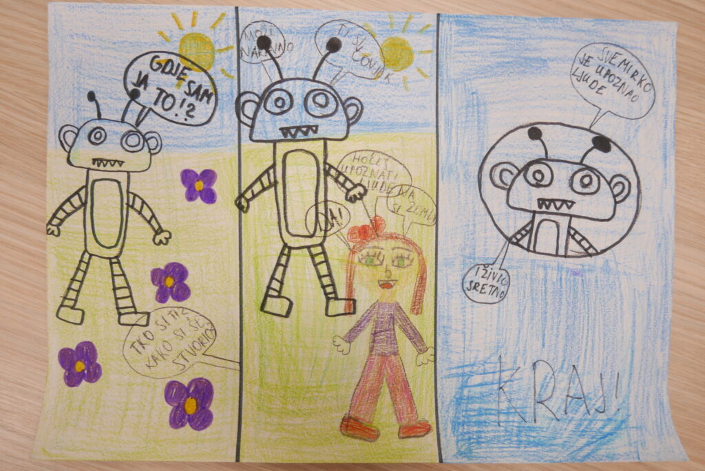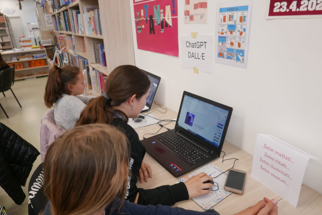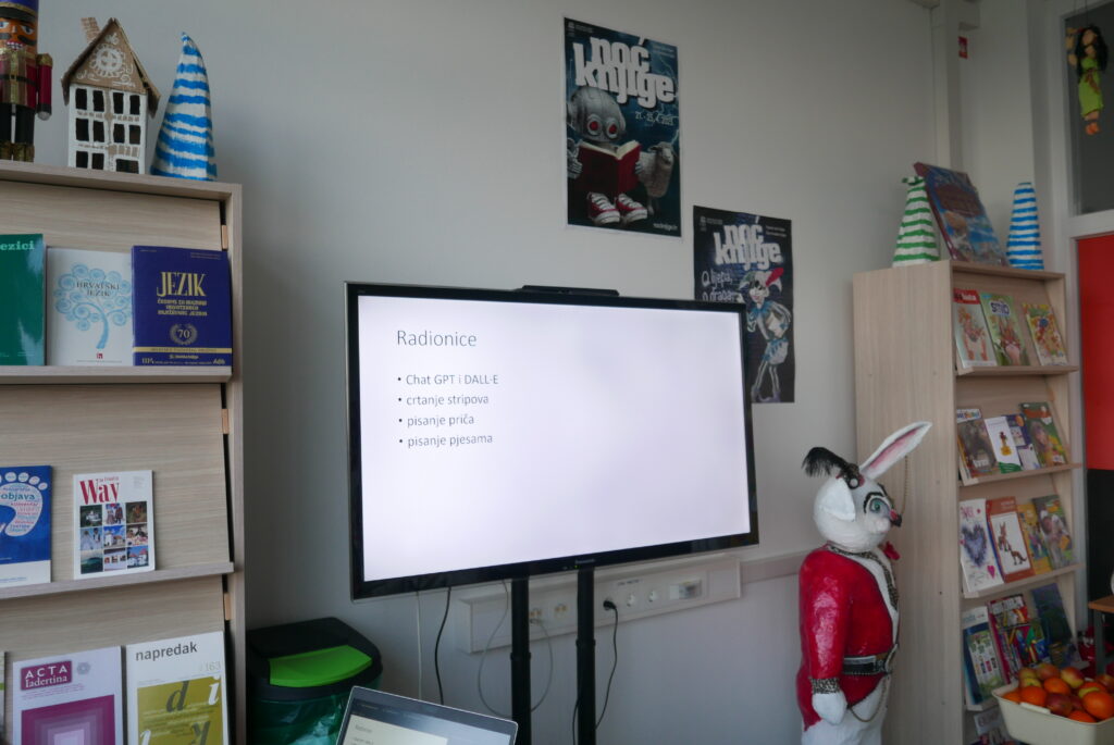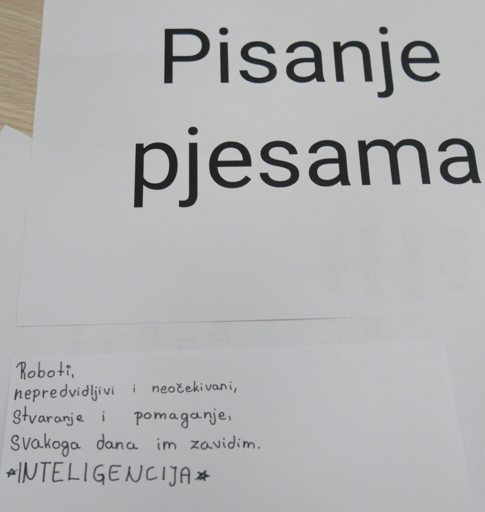 Nakon izlaganja učenici su mogli sudjelovati u 4 radionice. Na prvoj radionici učenici su crtali stripove, na drugoj pisali pjesme prema uputama umjetne inteligencije, na trećoj stvarali svoju priču u kojoj svaki učenik piše dio priče u nastavku. U četvrtoj radionici učenici su razgovarali s umjetnom inteligencijom pomoću programa Chat GPT-a. Tako je Chat GPT pisao pjesme o proljeću, smiješne pjesme, pjesme na kajkavskom narječju; odgovarao je na mnoga pitanja i davao prijedloge za imena kućnih ljubimaca, imena za budućeg brata; naveo je nekoliko vrsta sladoleda; prevodio je tekstove na njemački i engleski jezik i još mnogo toga. Nadamo se samo da Chat GPT neće preuzeti pisanje domaćih zadaća…