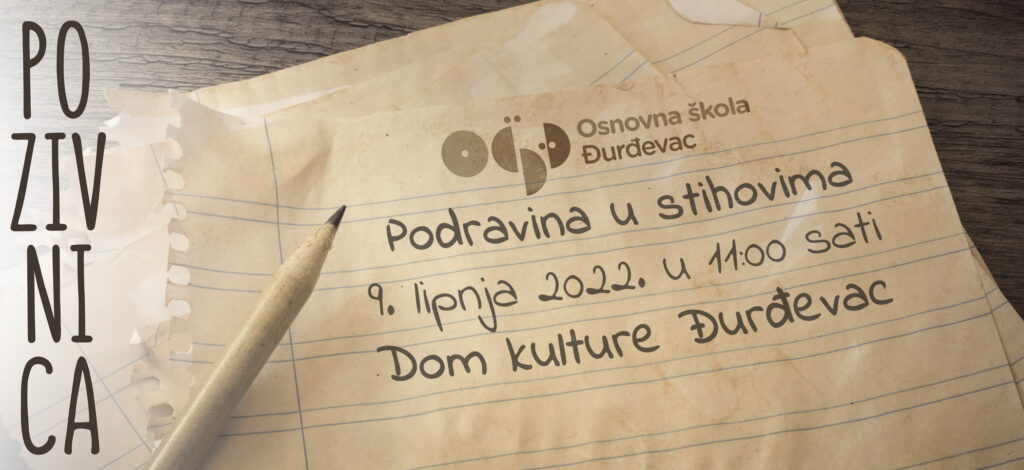 Dana 9. lipnja 2022. godine OŠ Đurđevac organizira javnu priredbu “Naša Podravina u stihovima” povodom njegovanja zavičajnog pjesništva. Priredba se održava u Domu kulture u 11:00 sati.