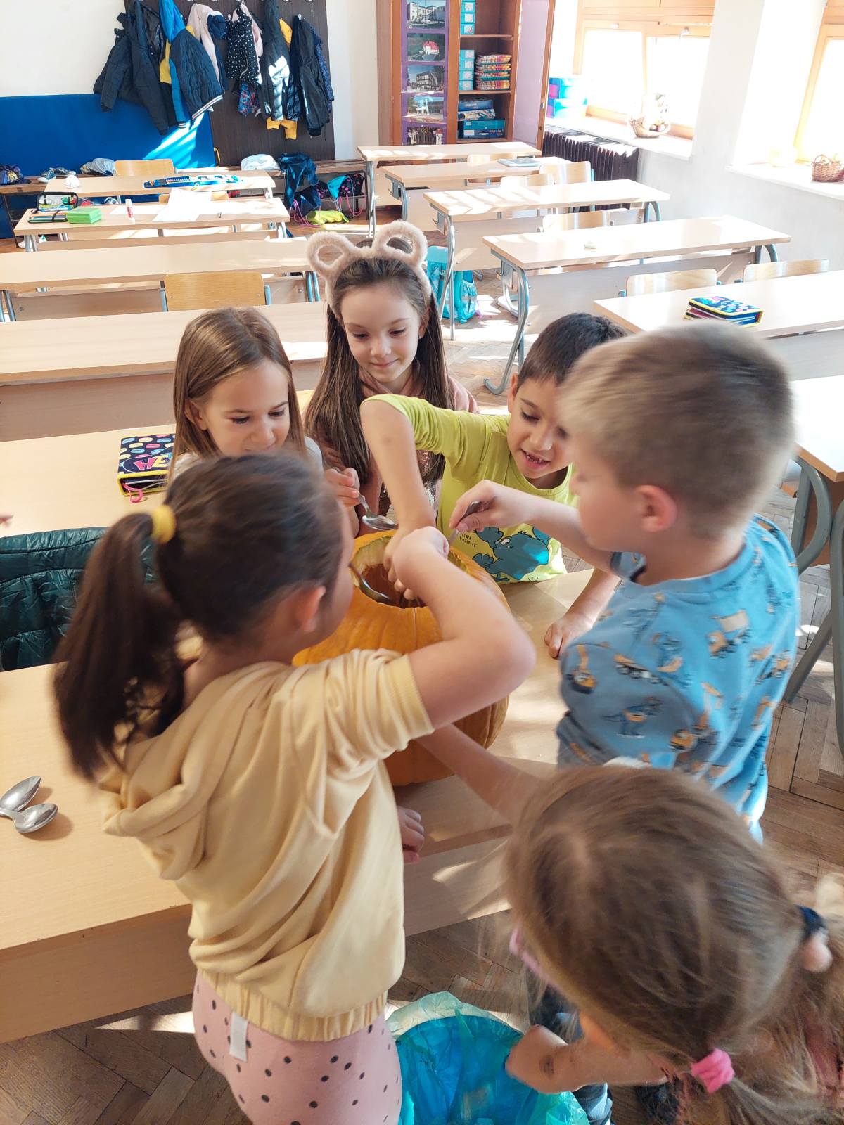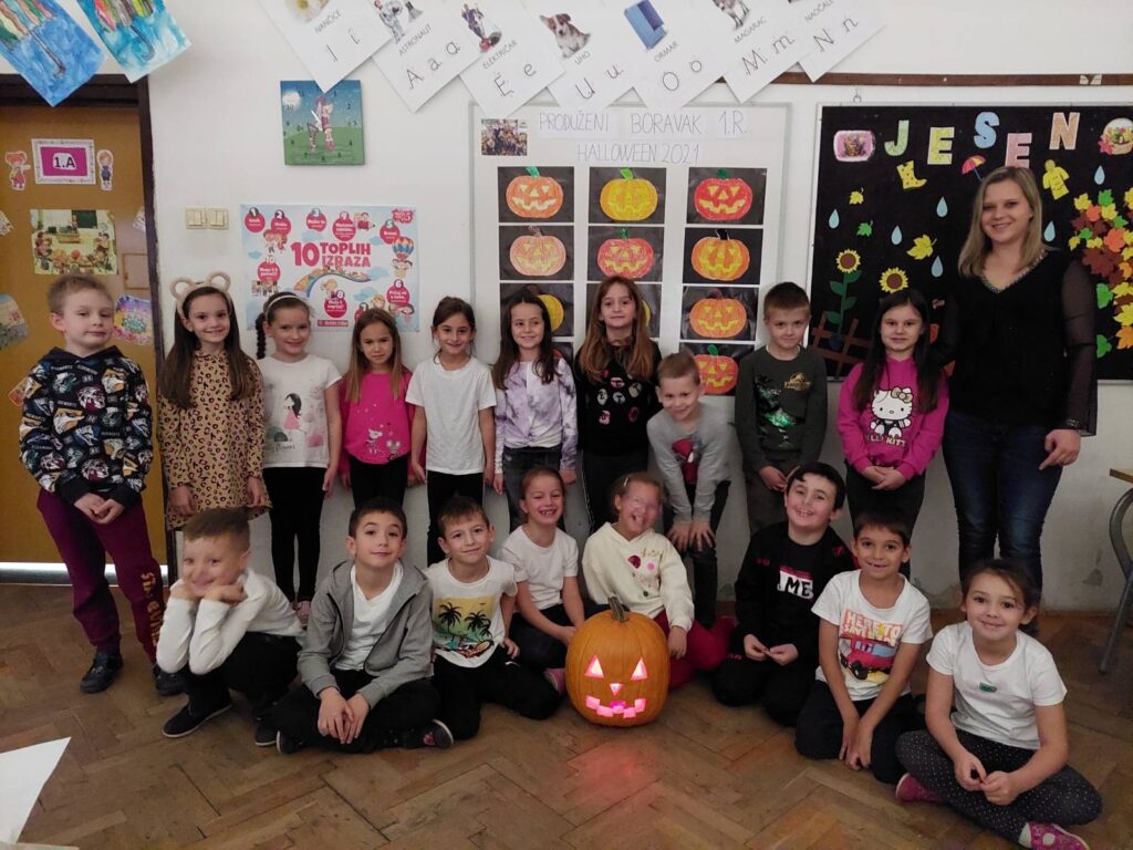 Prvašići su se upoznali sa običajem „Halloween“ i odakle dolazi običaj te zašto ga obilježavaju ljudi u drugim državama. Učenici su bojali s pastelama bundeve na papiru, rezali ih i lijepili na crni kolaž. Jednu pravu bundevu učenici su čistili, vadili koštice sa žlicom, te smo usput razgovarali: Kakve sve bundeve postoje (kakve boje, veličine i sl).