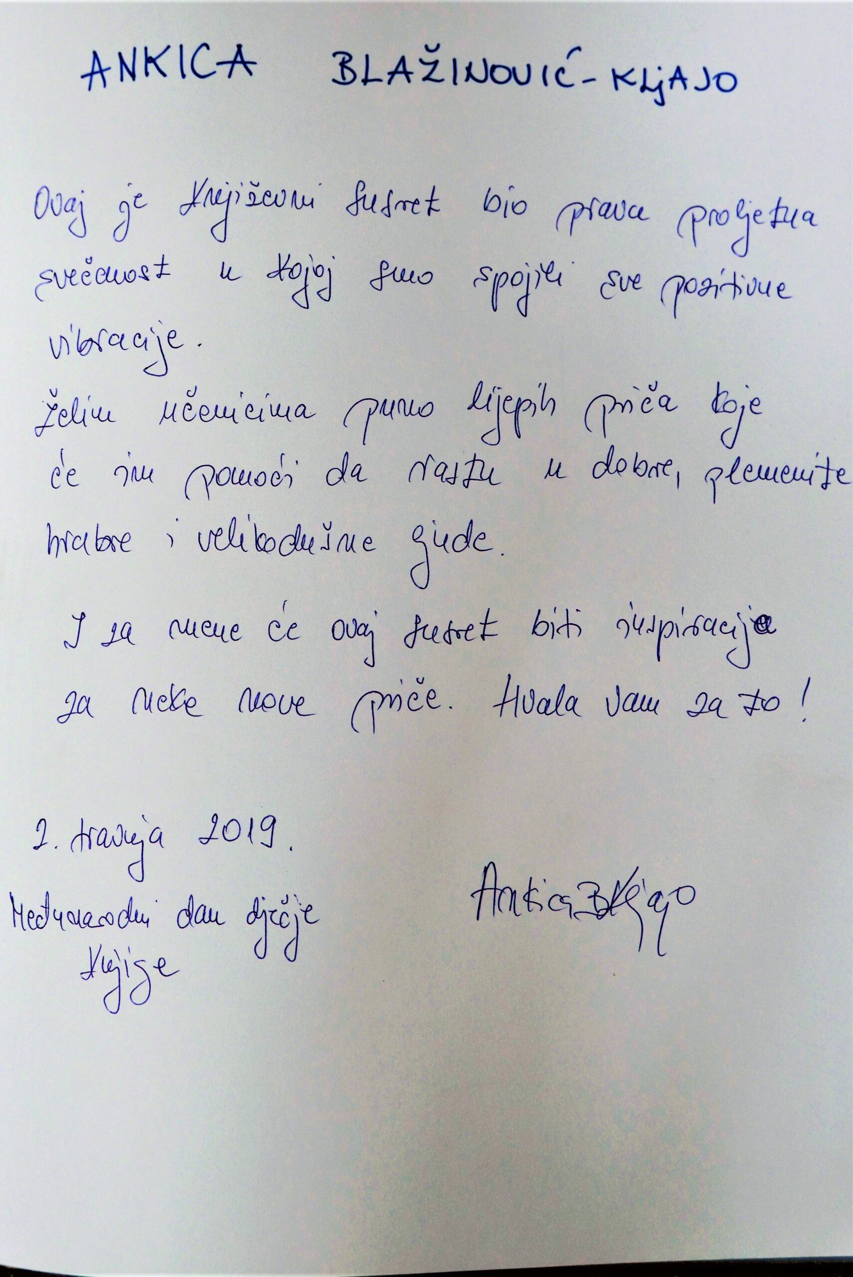 Povodom Međunarodnog dana dječje knjige, danas je našu školu posjetila svestrana gošća, Ankica Blažinović-Kljajo. Cijeli svoj radni vijek provela je u školi, najprije kao profesorica hrvatskog jezika, a sada radi kao diplomirana knjižničarka u OŠ Brestje. Počela je pisati još u osnovnoj školi kao mlada spisateljica.