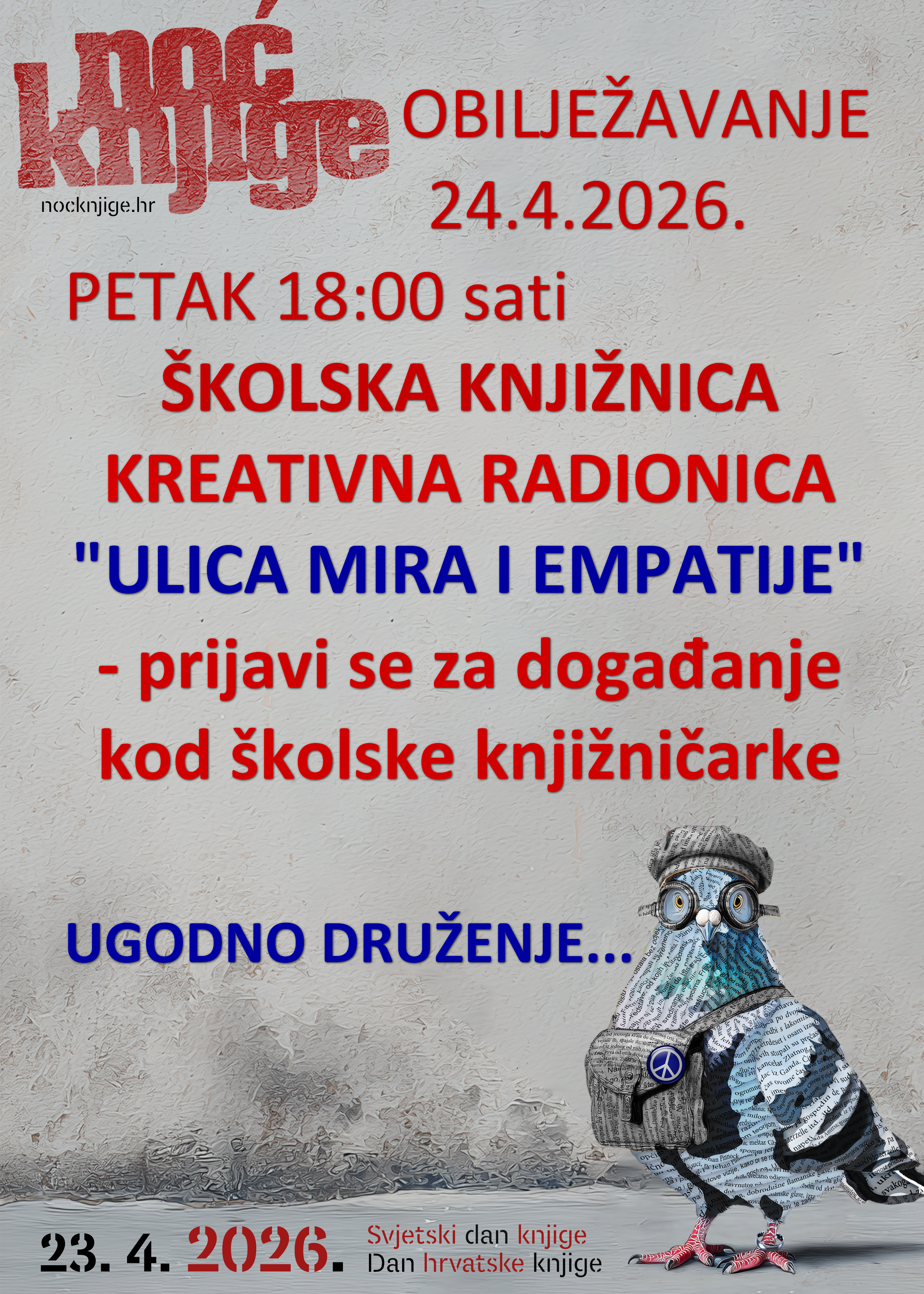 Obilježavanje Noći knjige na kreativnoj radionici “Ulica mira i empatije”, uz čestitku mira, uspjeha, sreće i zajedništva našem gradu za rođendan, održat će se u školskoj knjižnici 24. 4. 2026. (petak) od 18:00 do 20:00 sati.