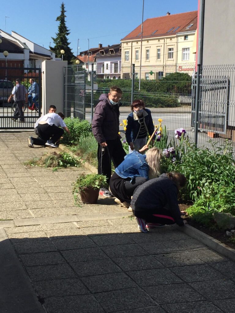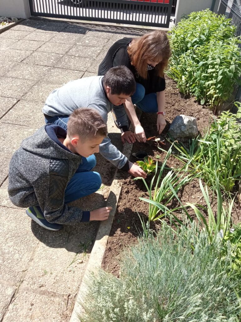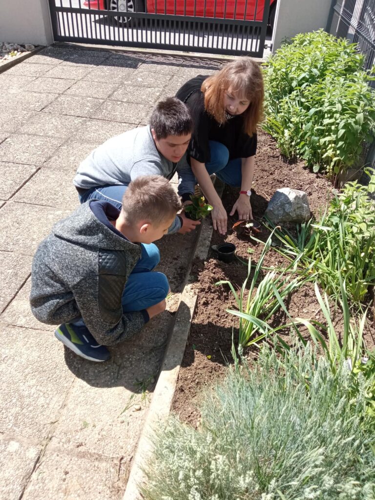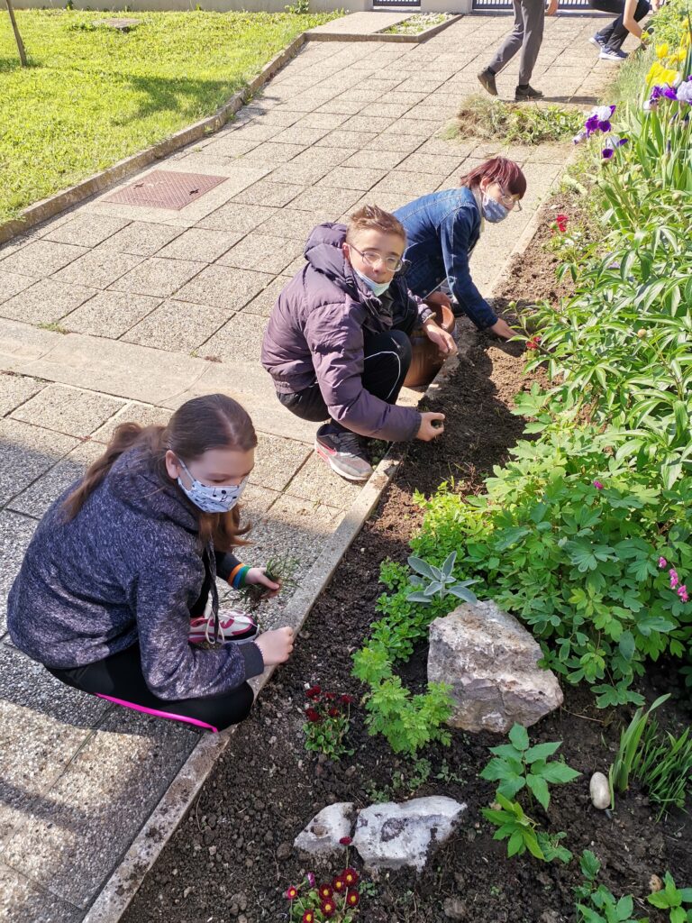 Dvorište škole, vanjski je prostor za učenje i igru kao i učenje putem igre. Na satima Tehničke kulture, učenici od 5. do 8. razreda Odjela za učenike s teškoćama u razvoju, uređivali su školski cvjetnjak. Uređenju cvjetnjaka, pridružili su se i učenici 3. odgojno-obrazovne skupine koji su zasadili donirane sadnice cvijeća roditelja Popadić. Ovo je bila praktična prilika podsjetiti se koje biljke rastu u našem cvjetnjaku, kako se biljke njeguju, koje alate koristimo i što su korovi. Učenici su bili motivirani za rad i vrednovali aktivnost uređenja cvjetnjaka visokom razinom osobnog zadovoljstva.