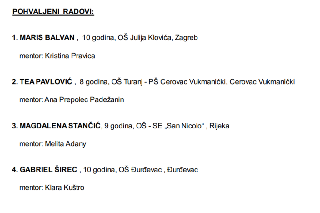 Likovni rad učenika Gabriela Šireca, učenika 4. a razreda, pohvaljen je od članova komisije. Čestitke Gabrielu i svima koji su sudjelovali na natječaju.