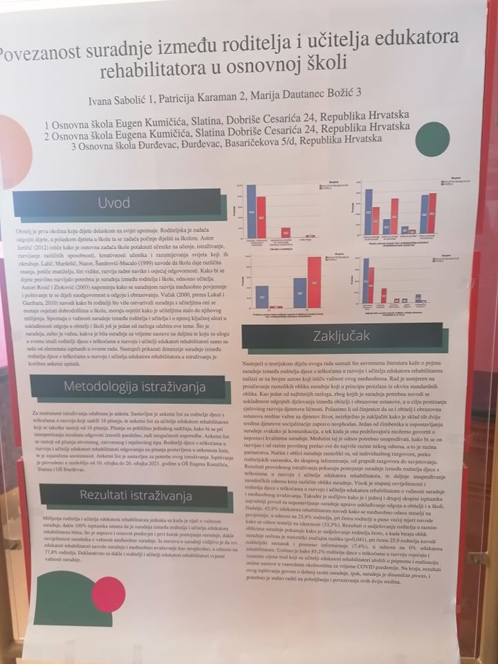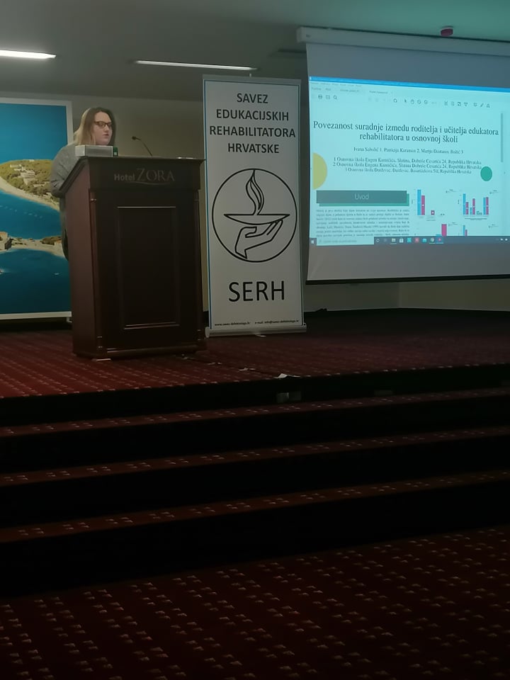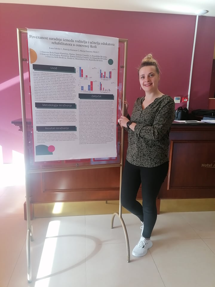 Kao aktivna sudionica konferencije, zajedno s kolegicama Ivanom Sabolić i Patricijom Karaman iz Osnovne škole Eugen Kumičić, Slatina, predstavila je rad i istraživanje “Povezanost suradnje između roditelja i učitelja edukatora rehabilitatora u osnovnoj školi” .